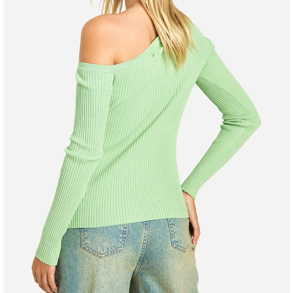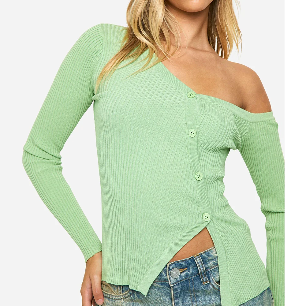 2025 Fall Women's Long-Sleeved Casual Pullover Sweater Off-Shoulder Slim Knitwear with Button Decor Front Logo Sexy Short Design