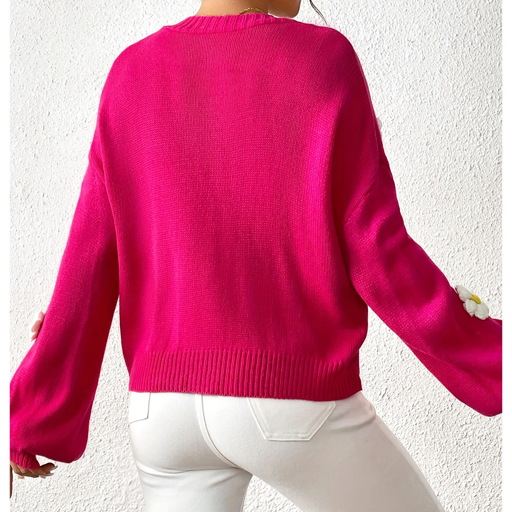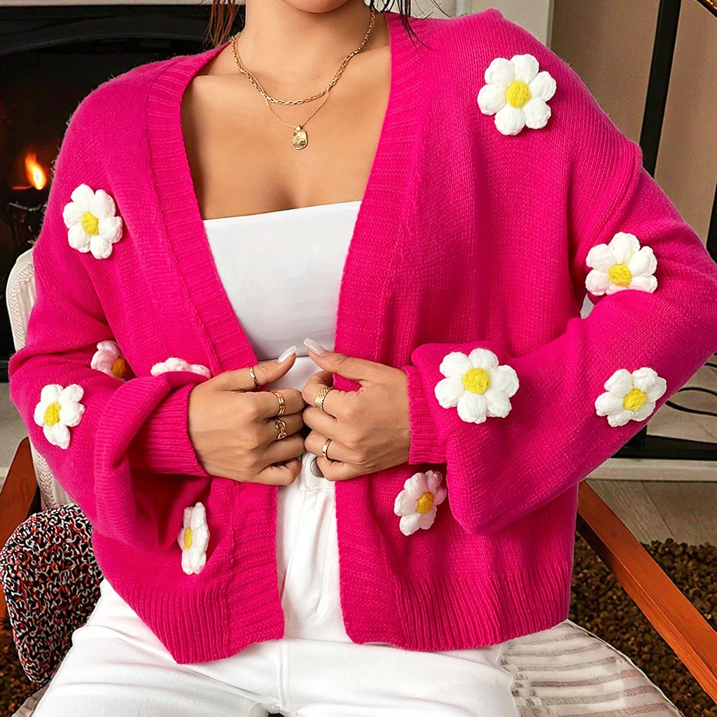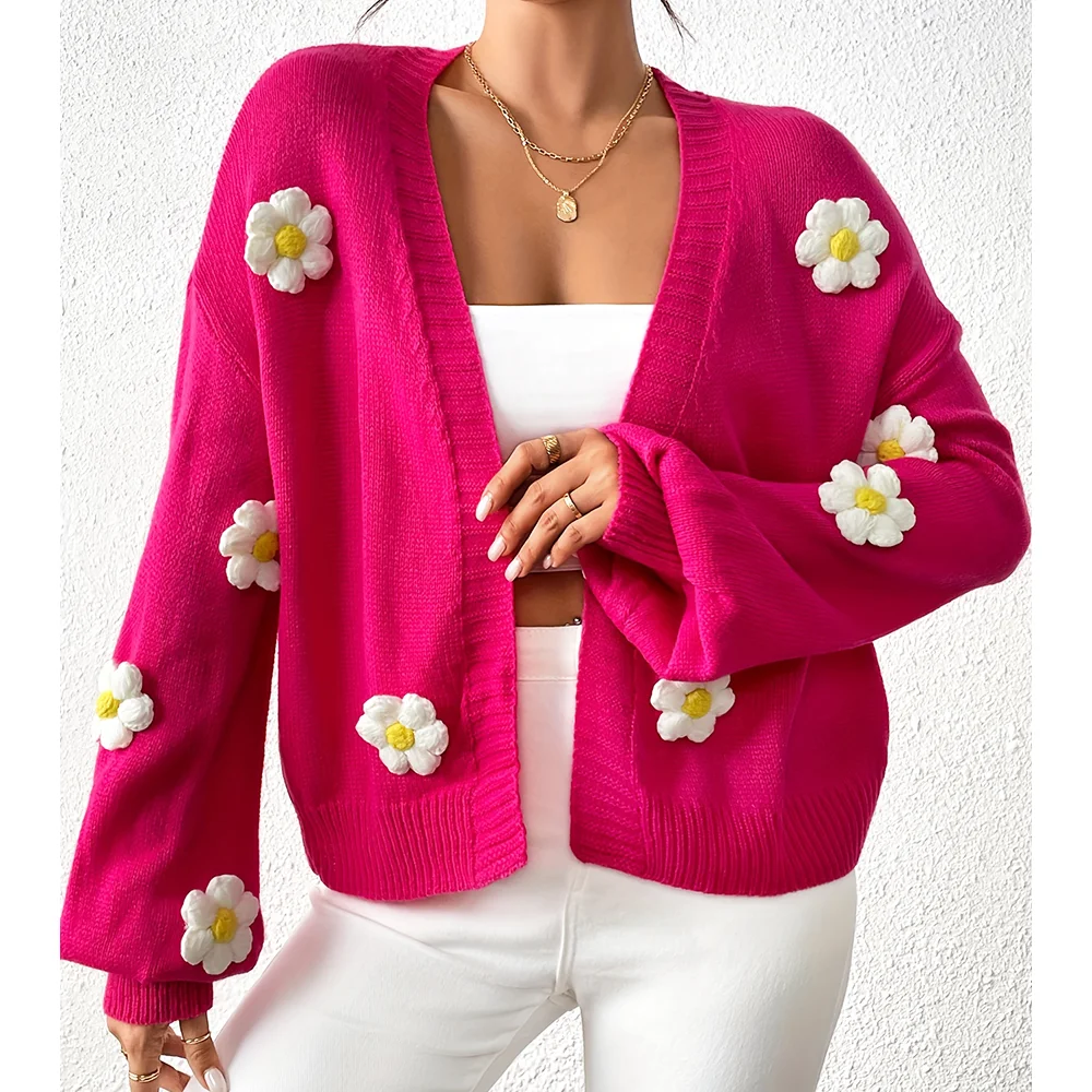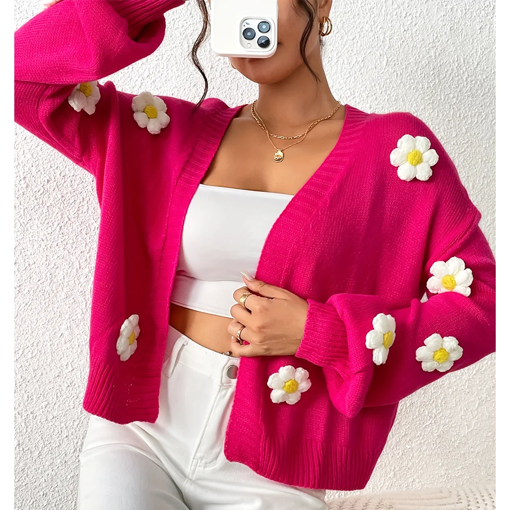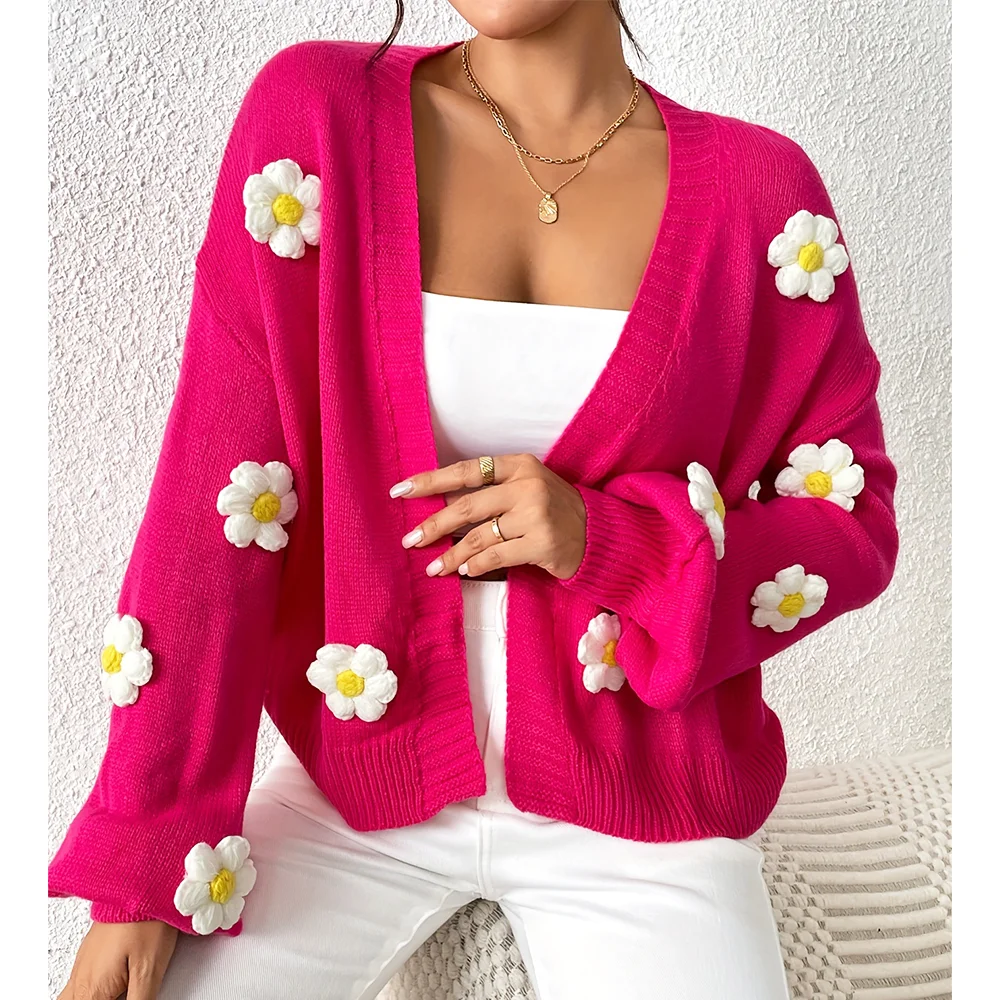 Wholesale Women's Handmade Crochet Floral Cardigan V-Neck Long-Sleeved Single Buttons Knitted Winter Sweater Jacket Sweet Flower