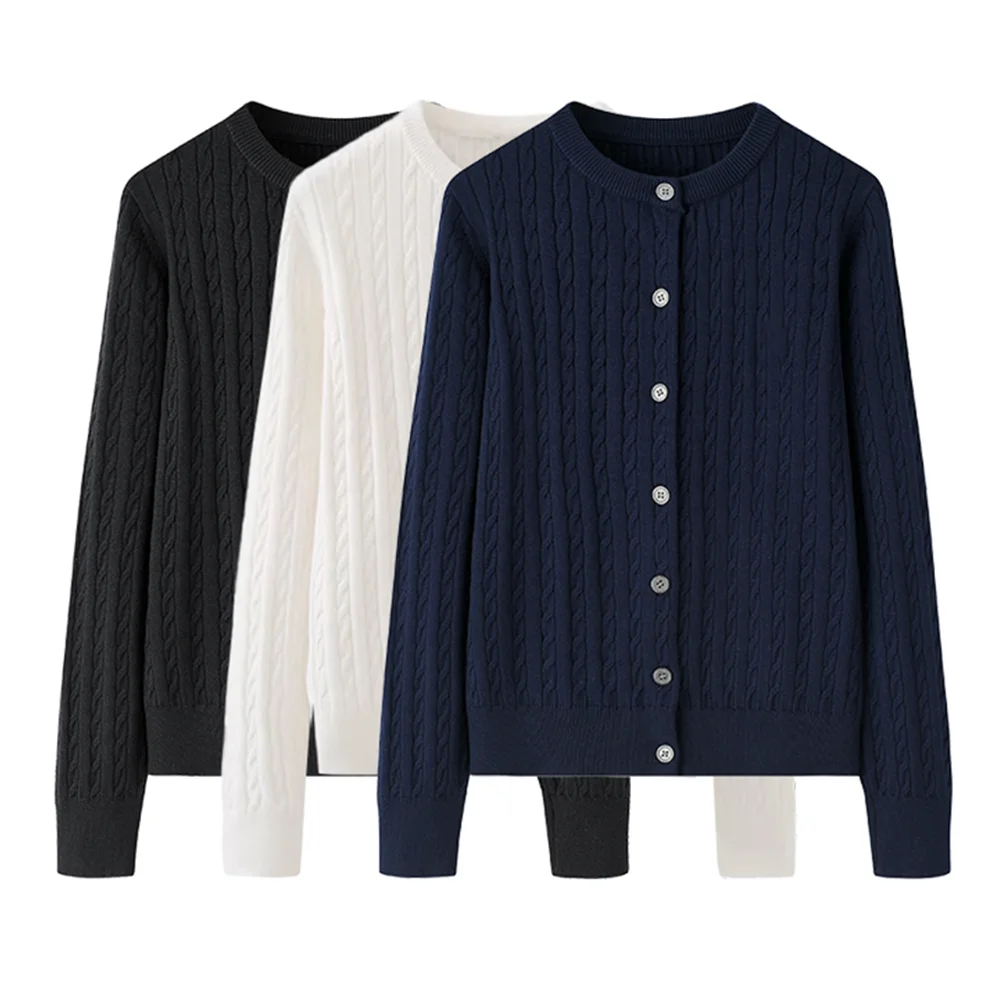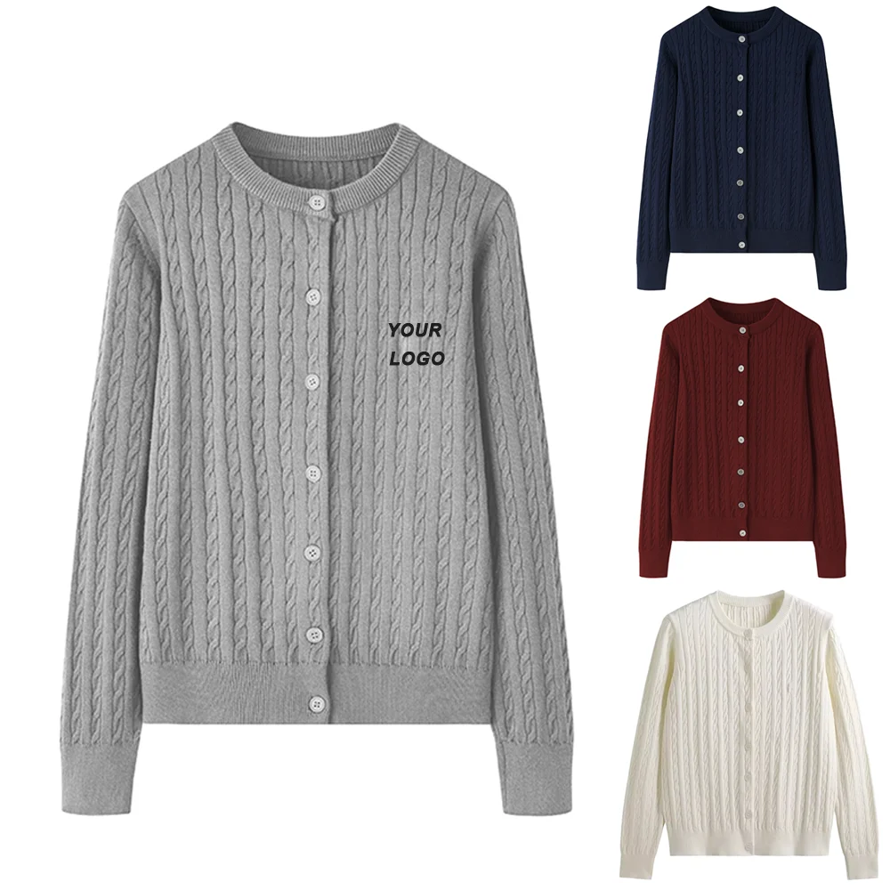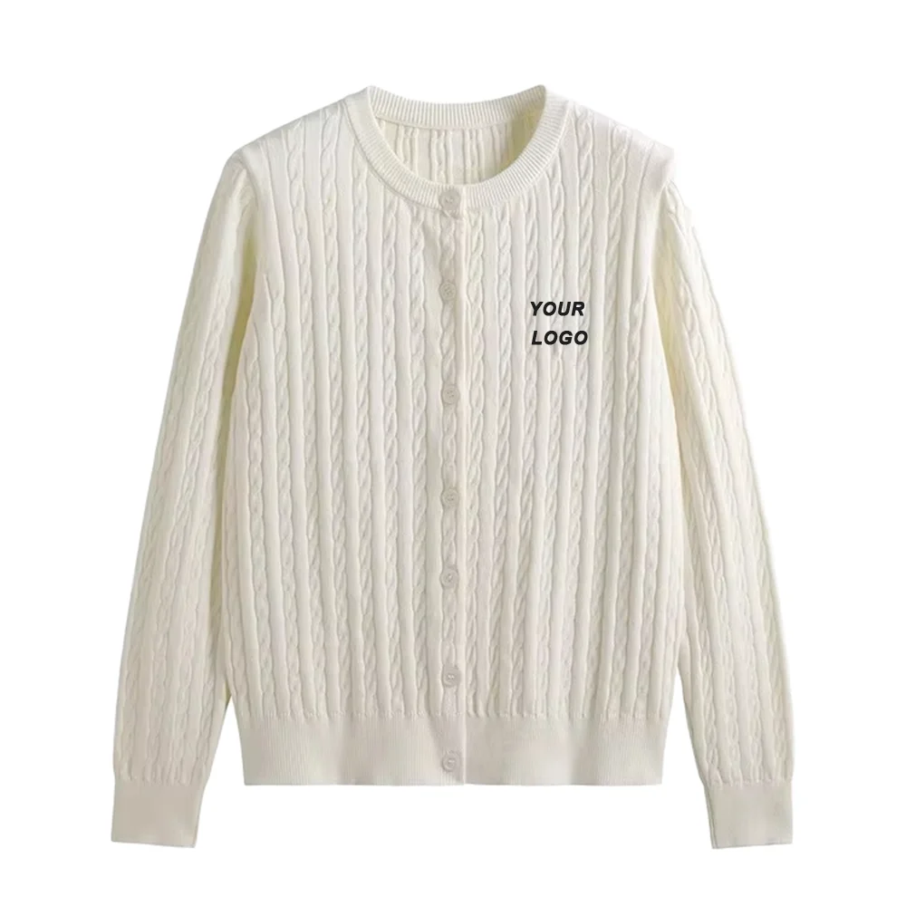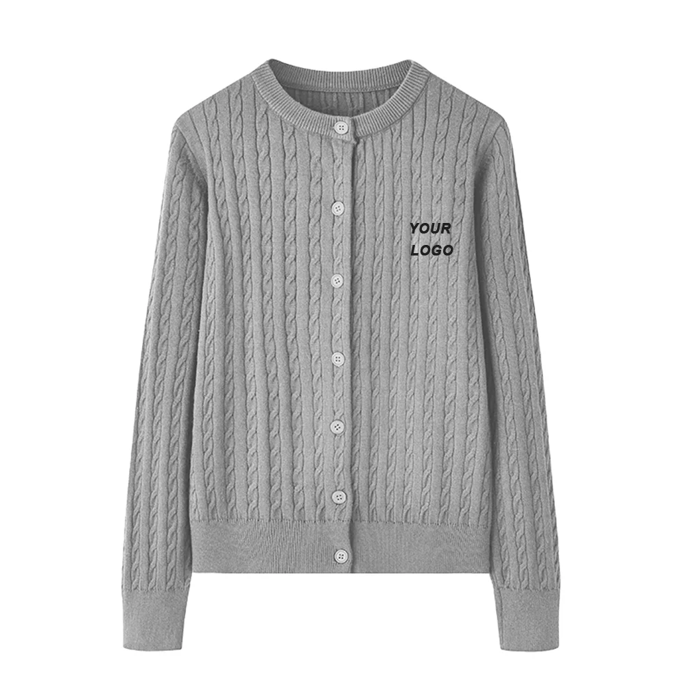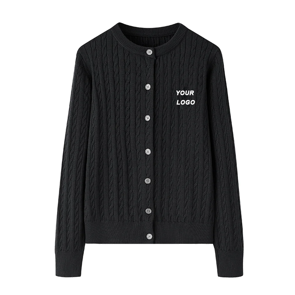 Custom Women's Cable Knitted Long Sleeve Crew Neck Sweater Cardigan Autumn Knit Coat with Button Closure and Embroidered Logo