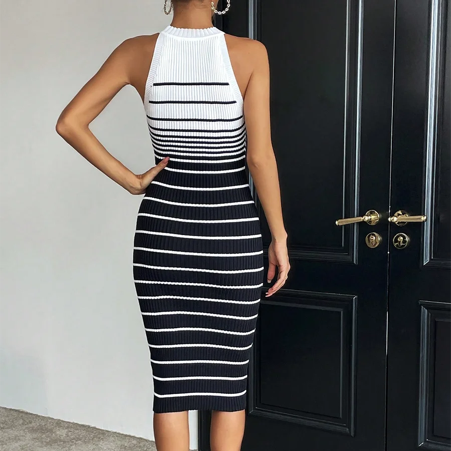 Elegant Women's Sleeveless Bodycon Knitted Dress Gradient Stripe Tight Evening Party Dress with Dating Neck for Summer