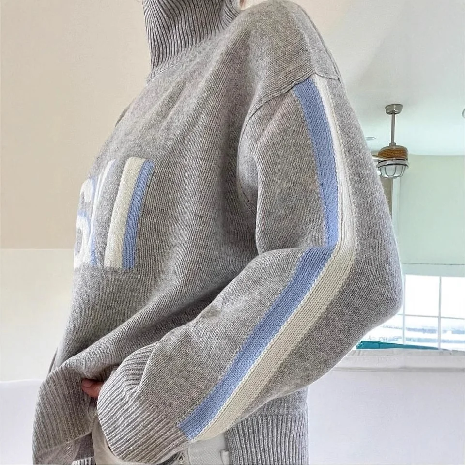 OEM Customized Long Sleeve Pullover Turtleneck Sweater for Women Winter Casual Knitted Jacquard Pattern English Letters Ski