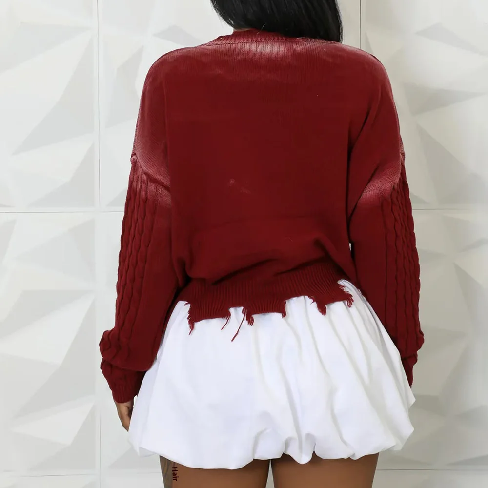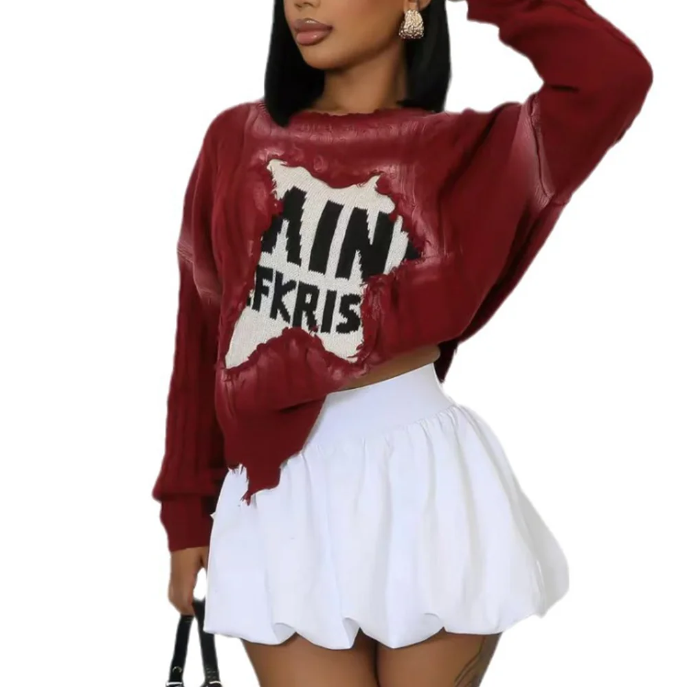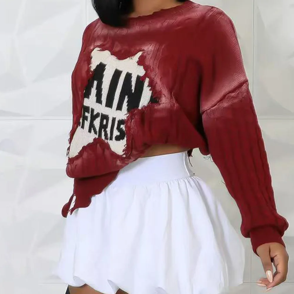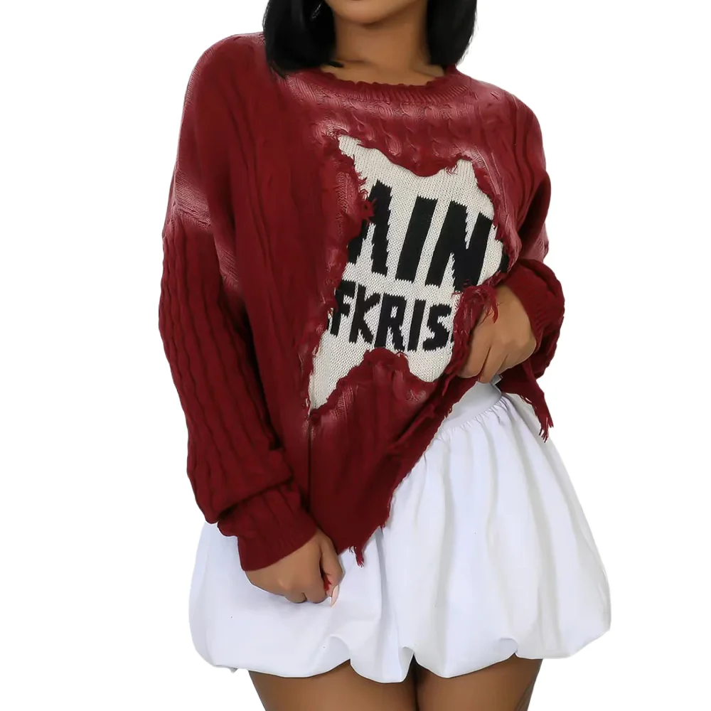 Autumn Vintage American Style Women's Long Sleeve Distressed Tie-Dye Pullover Sweater Loose Knitted Color-Block Letter Sweater