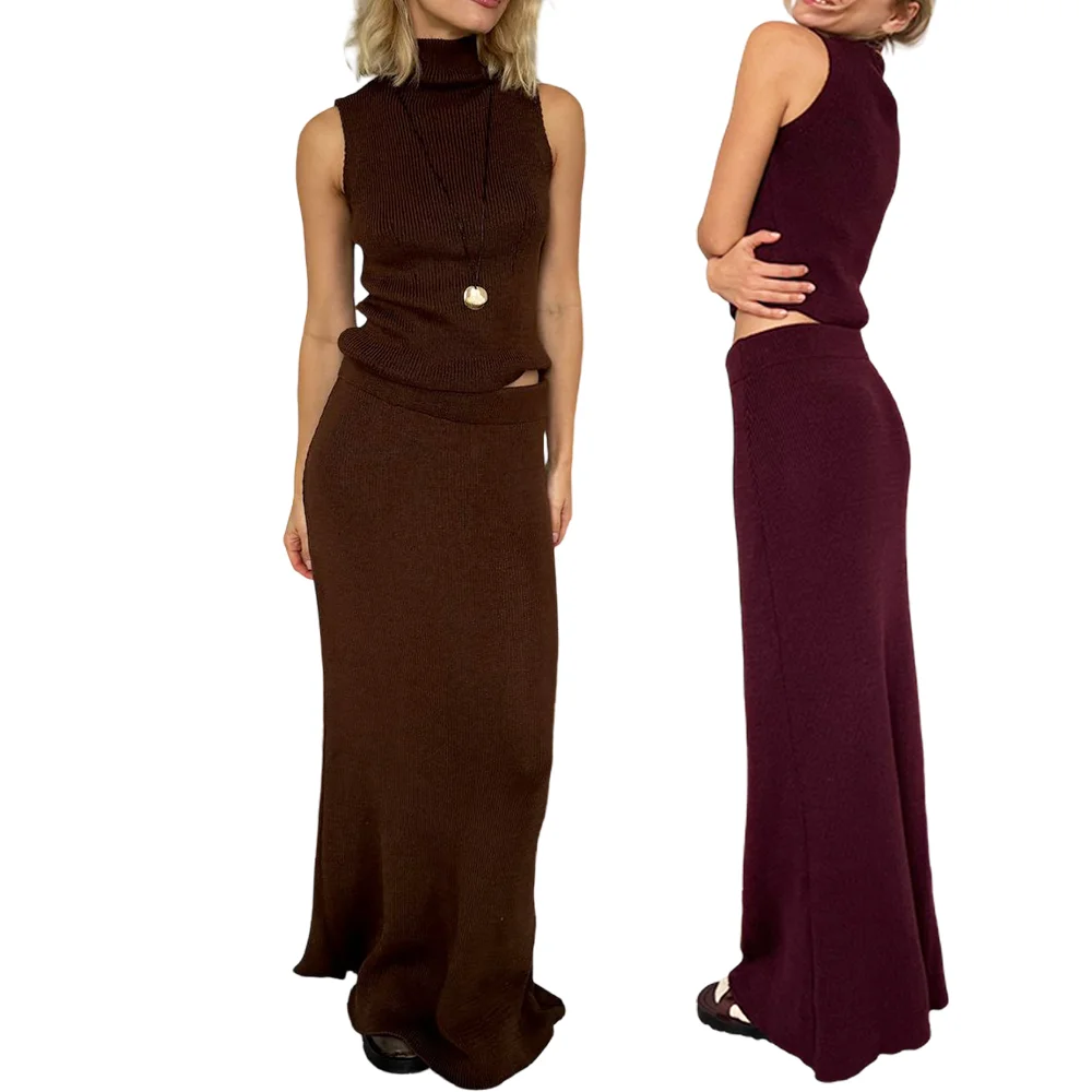 Custom Ladies Solid Knitted 2-Piece Set Long Skirt Turtleneck Sleeveless Smiling Sweater Vest for Autumn French Breathability