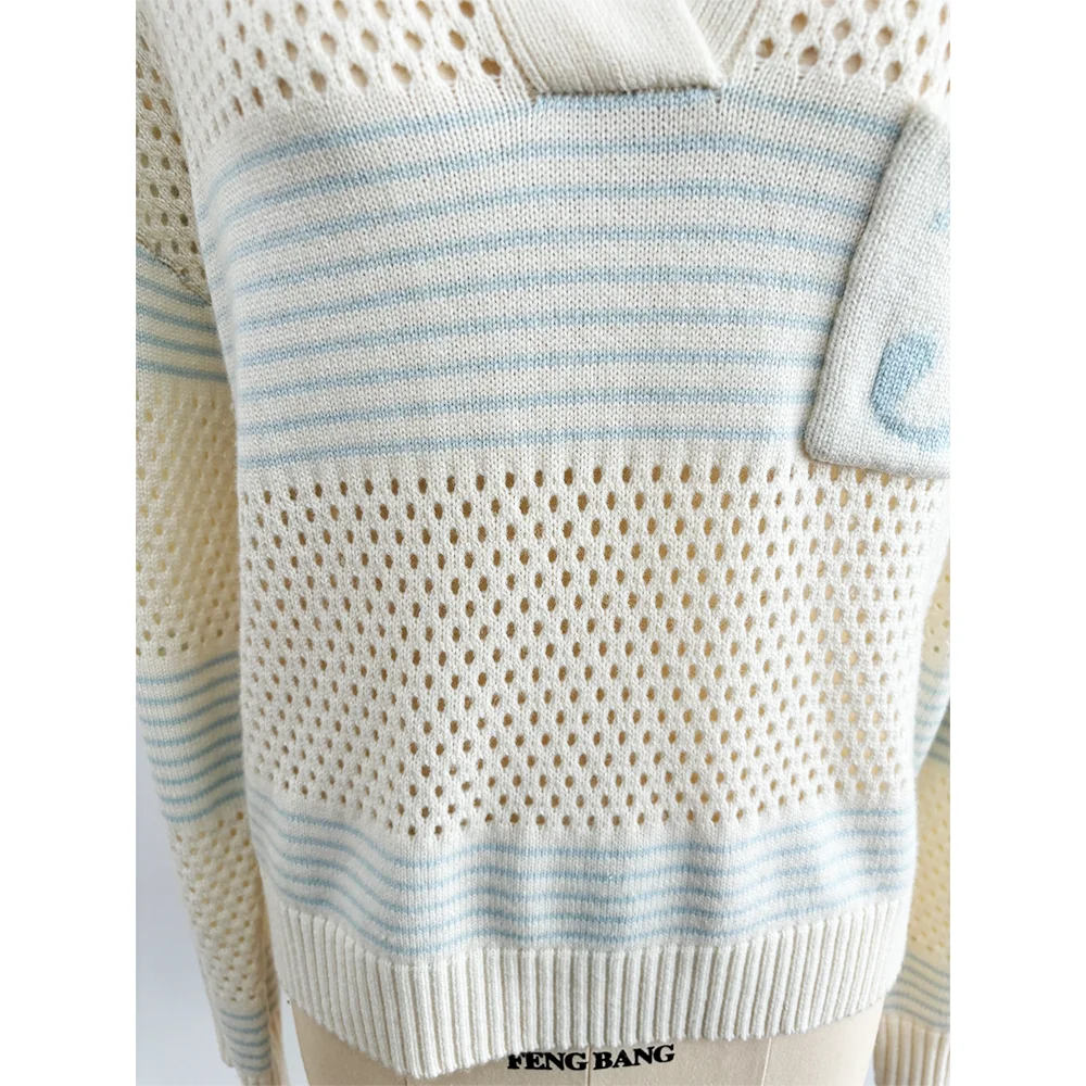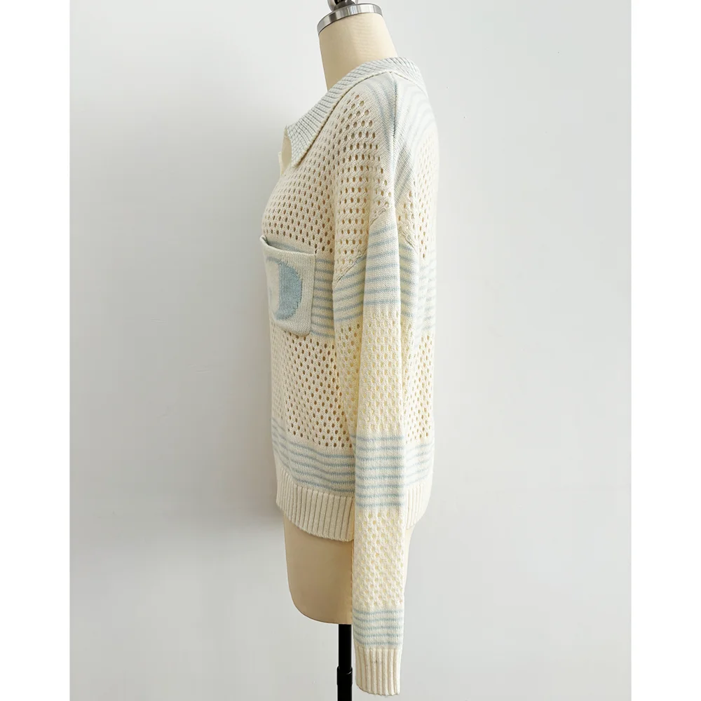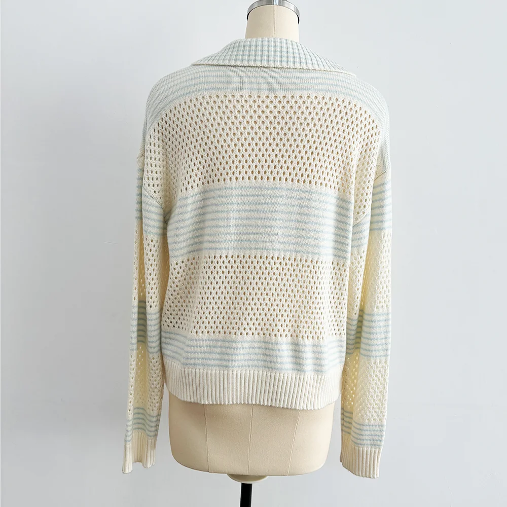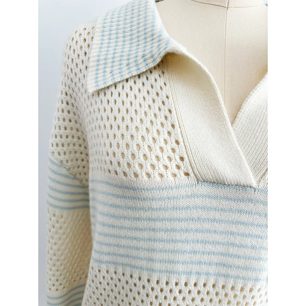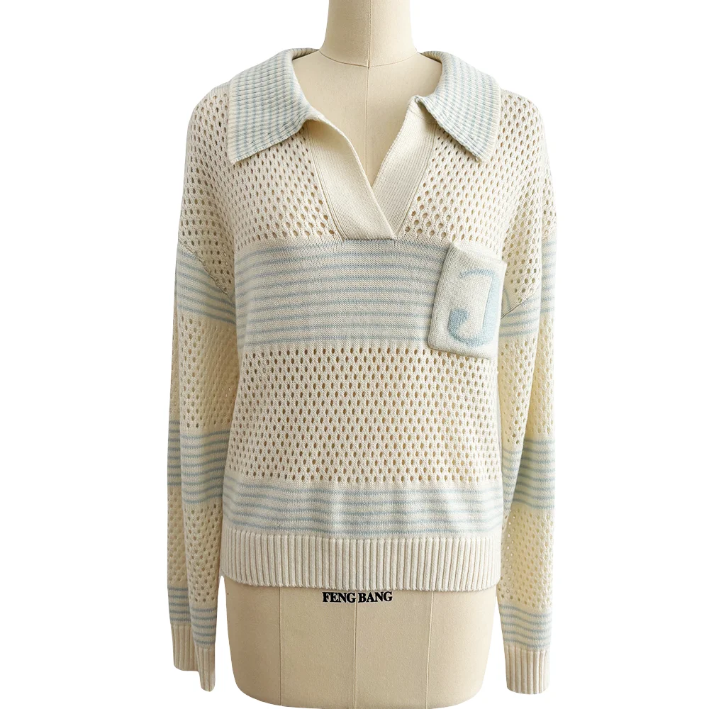 OEM Customized New Lapel Polo Neck Ladies Pullover Knitwear Casual Hollow Design Knit Top Loose Spring Womens Pullover Sweater