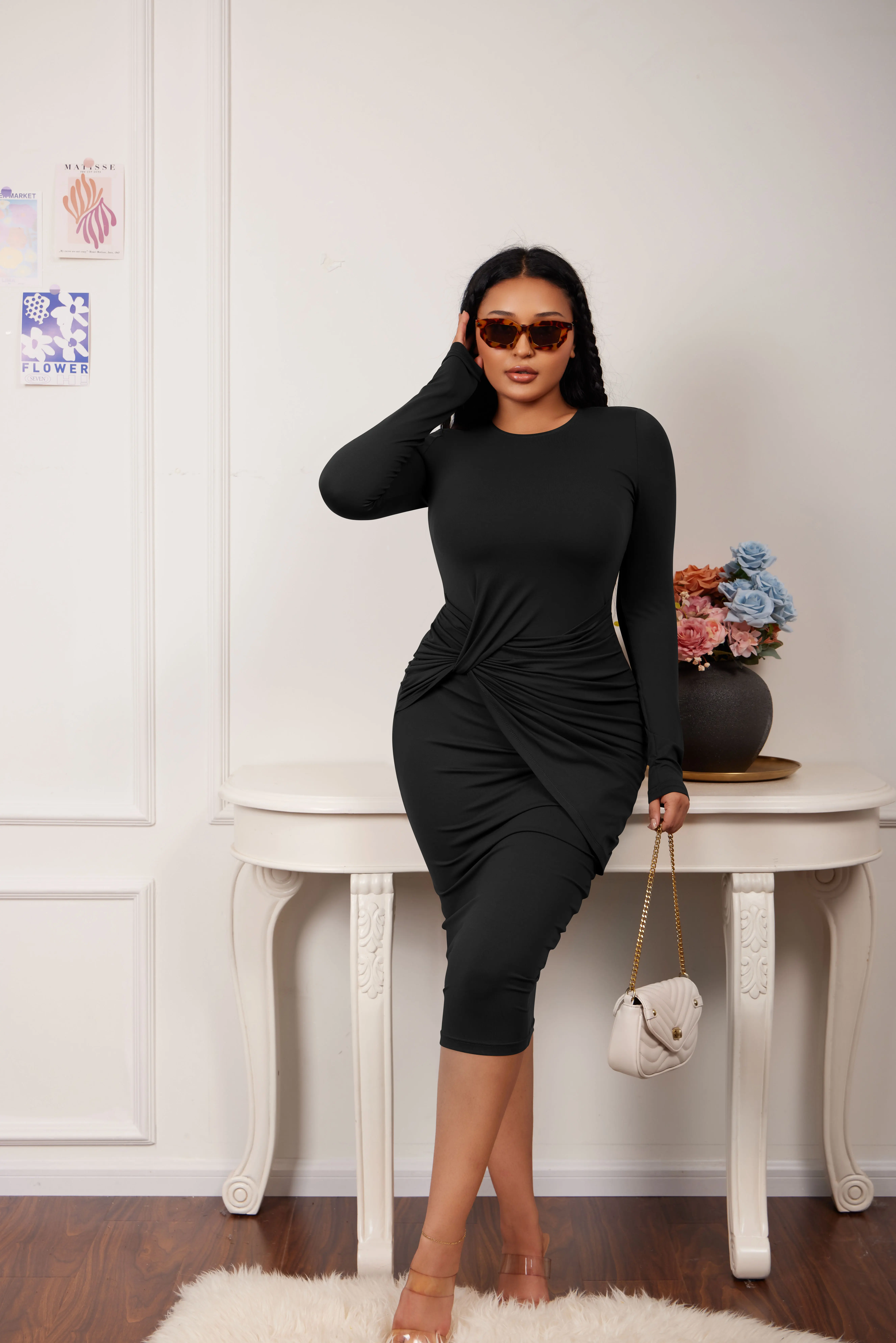 New Women's Casual Long Sleeve Crew Neck Tie Kont Ruched Bodycon Club Midi Pencil Dress