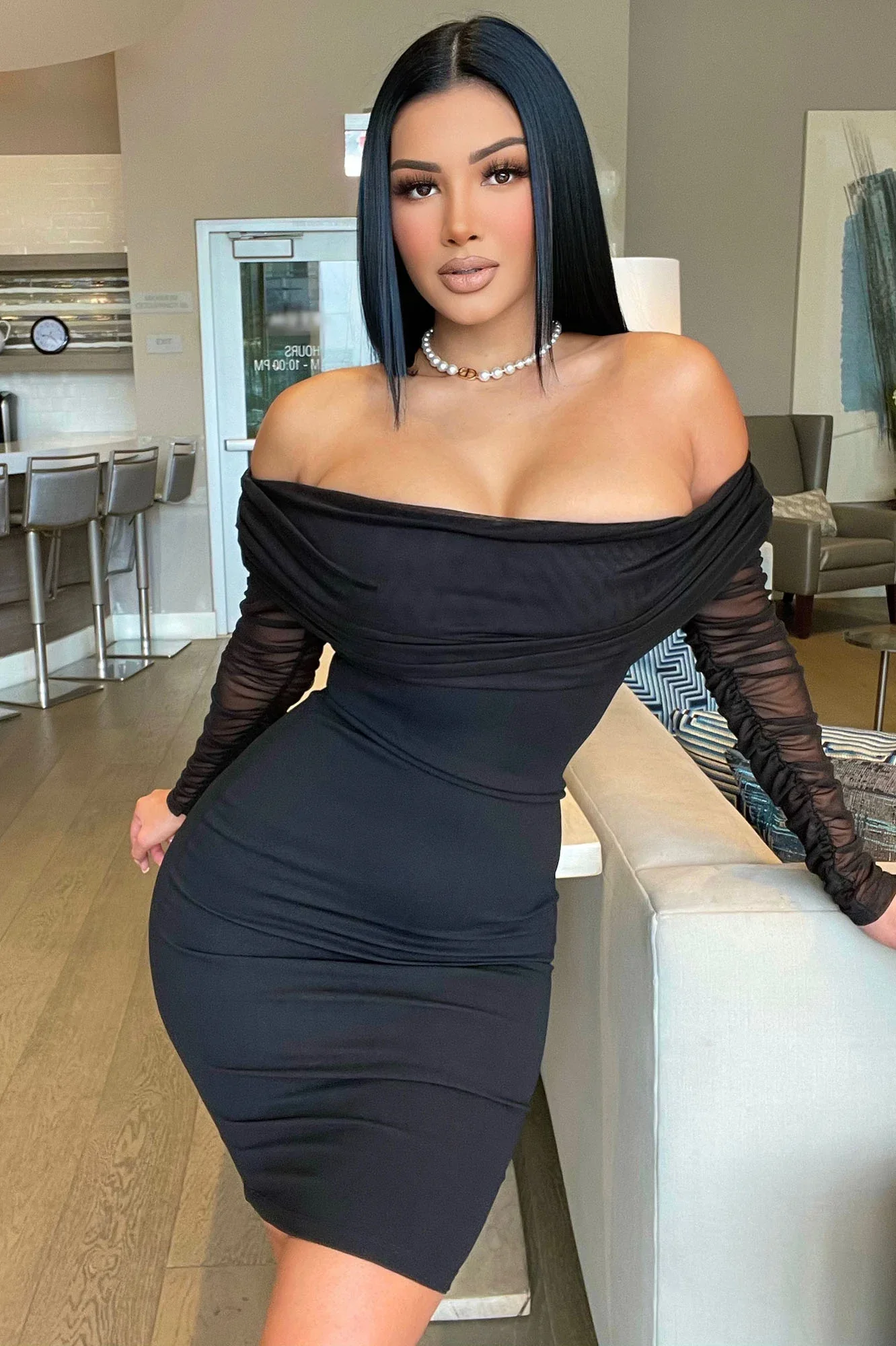 ZYHT 21938 Black Velvet Mini Dress Square Neck Long Puff Sleeves with Pearl Trim & Crystal Dess Flared Scalloped Hem Dresses