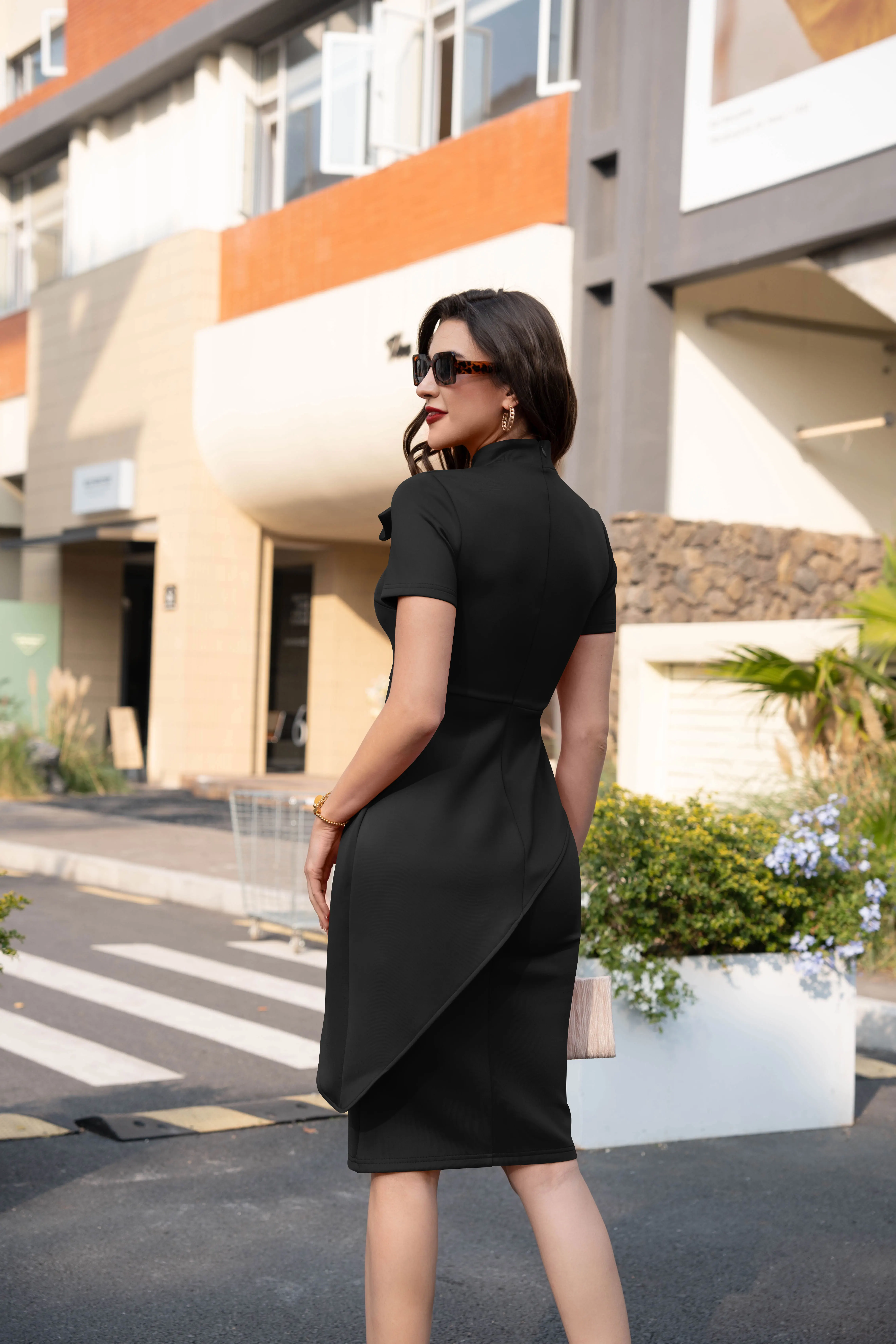 Latest Design Women Lady Elegant Short Sleeve High Neck With Bow Slim Pencil Work Career Dresses