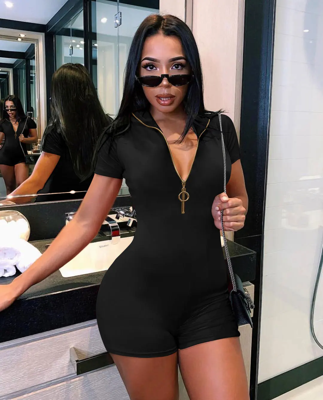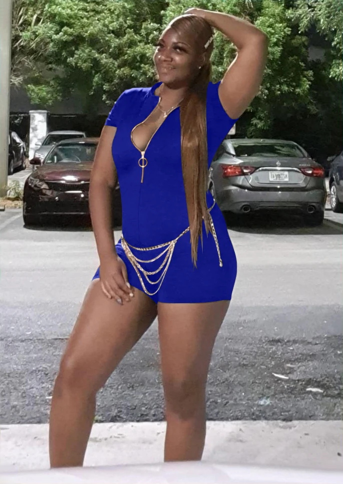 Stylish Women's Short Sleeve Jumpsuit Stand Front Zipper Solid One Piece Jogging Jumpsuit Bodysuit