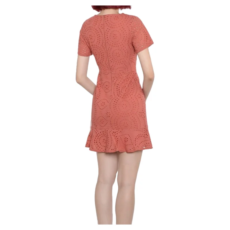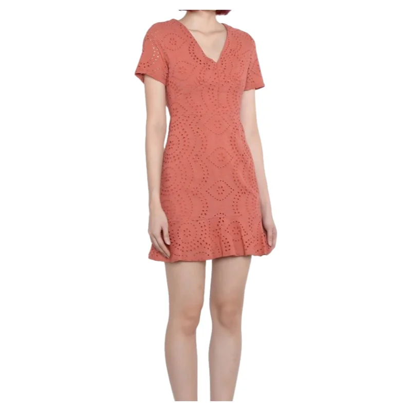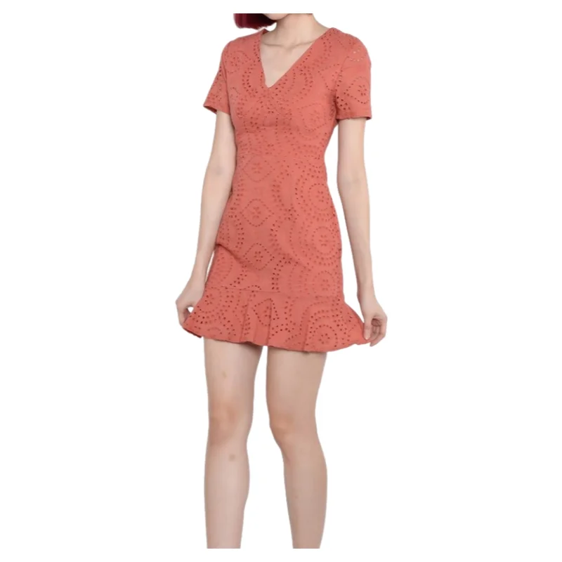 High Quality Custom Cotton Burnt Out V-neck A-line Ruffle Hem Mini Dress Clothing for Woman