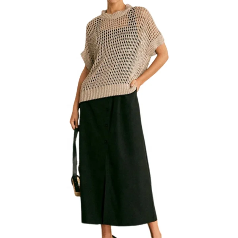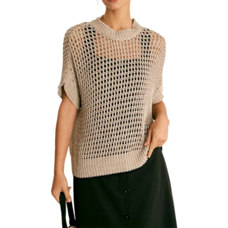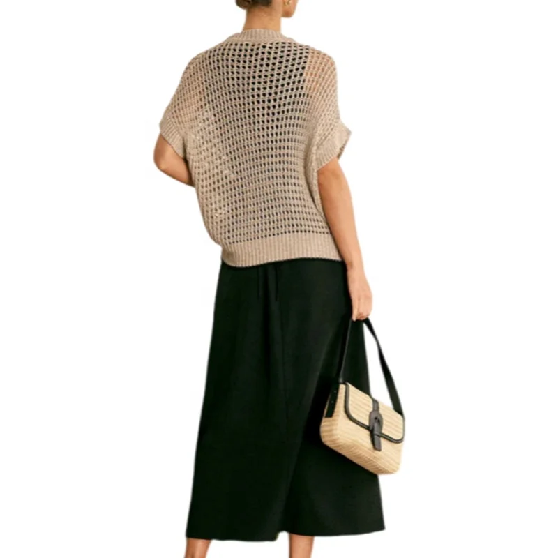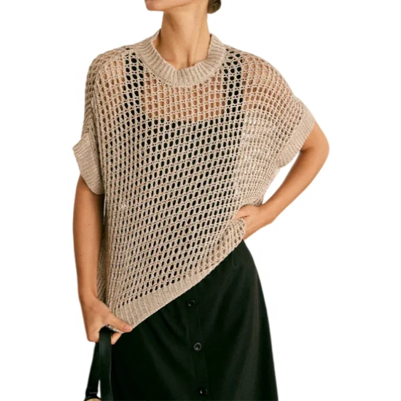 High Quality Crewneck Blank Transparent Mesh Pullover Knitwear Drop Shoulder T-Shirt Top for Woman