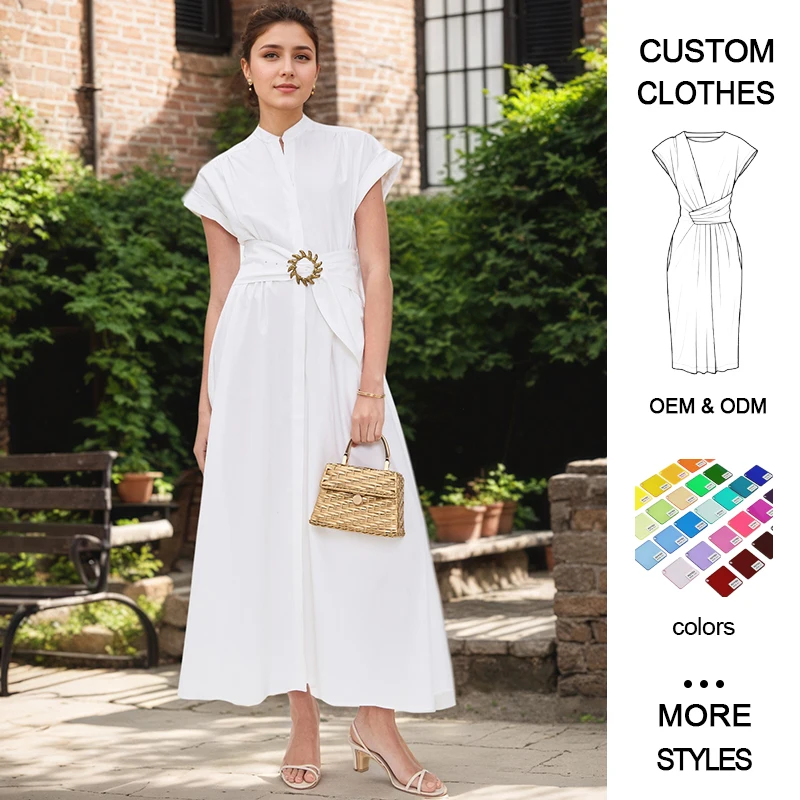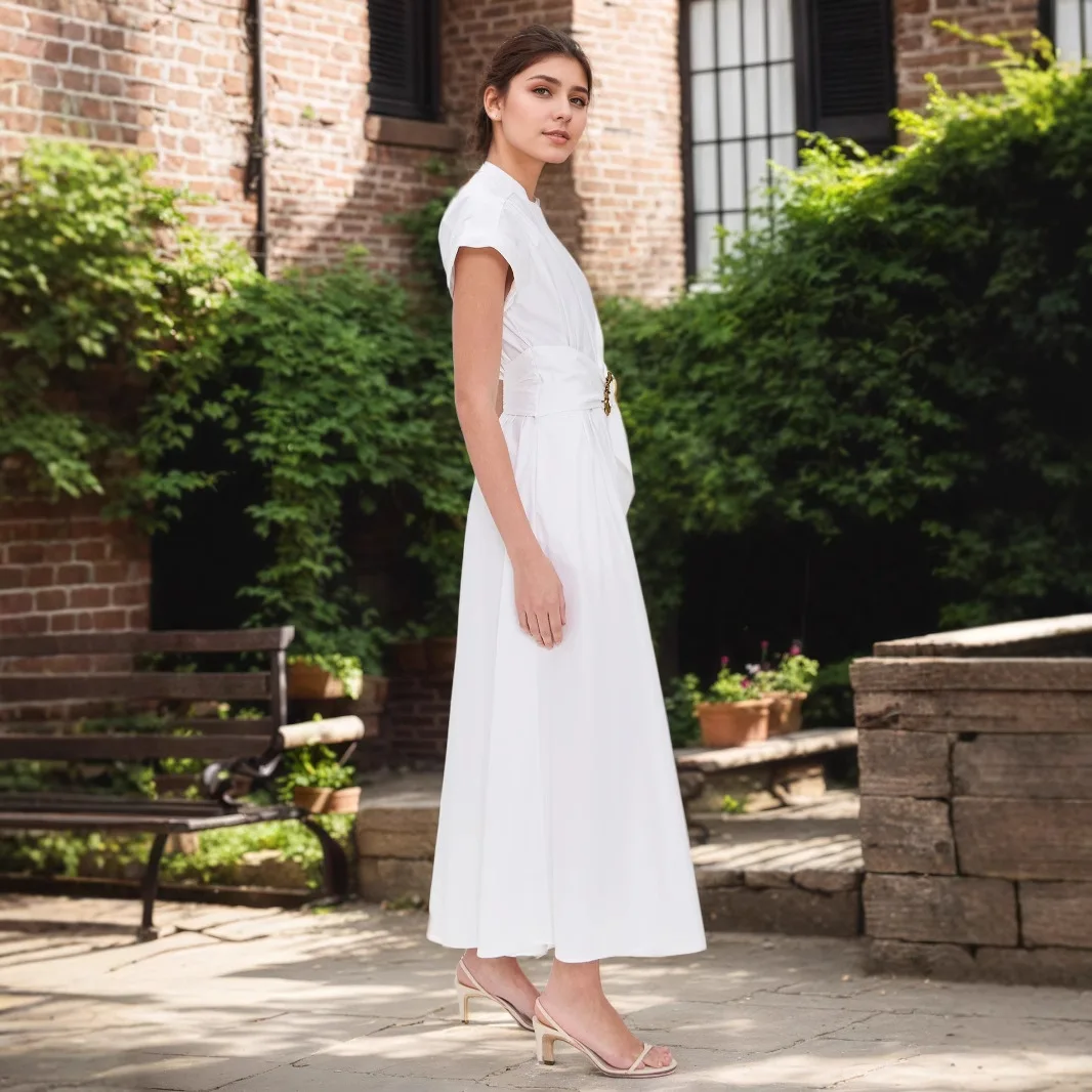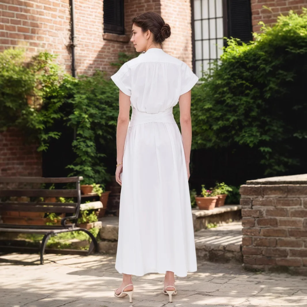 Solid Short Sleeve Maxi Dress White A-Line Elastic Waist Casual Vintage Style Maxi Modest Summer Shirt Features for Winter