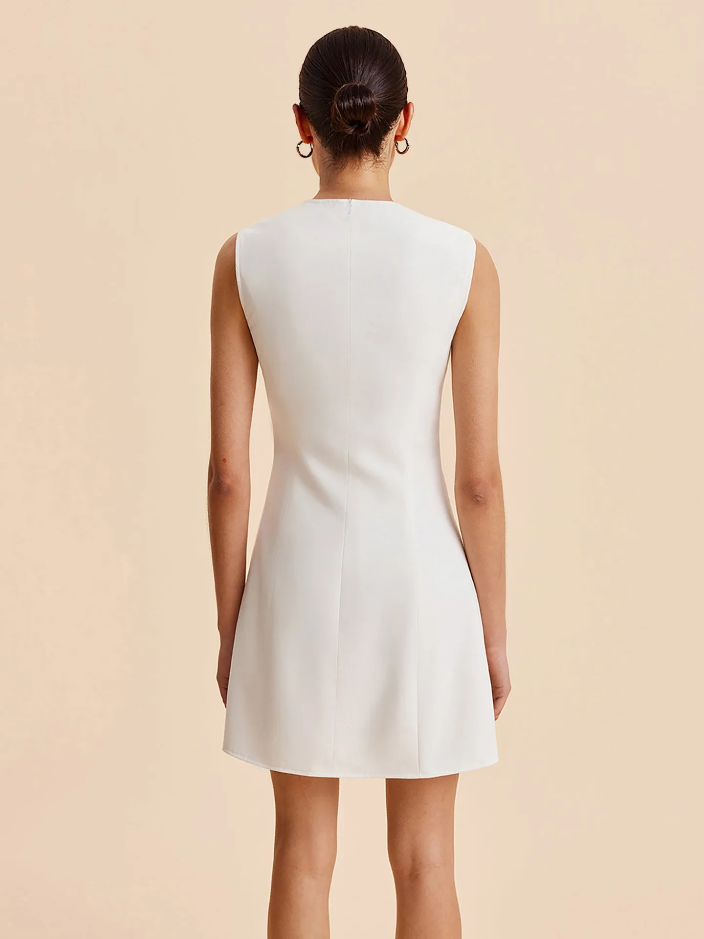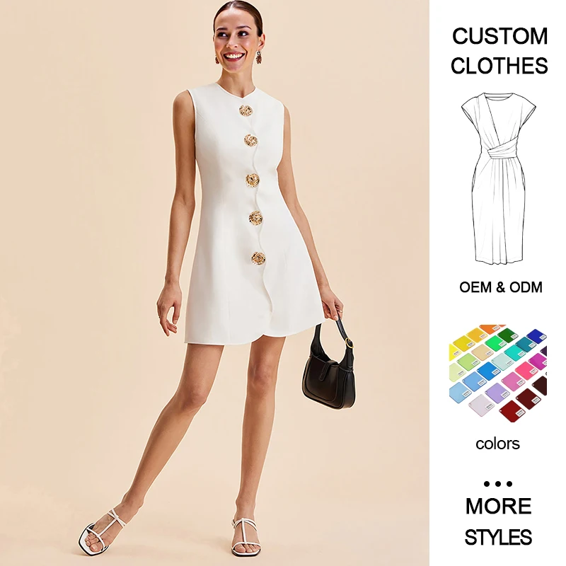 Premium Women's Elegant Fitted Midi A-Line Summer Dress Slim Fit Sleeveless Formal Office Lady Button Decoration Solid Pattern