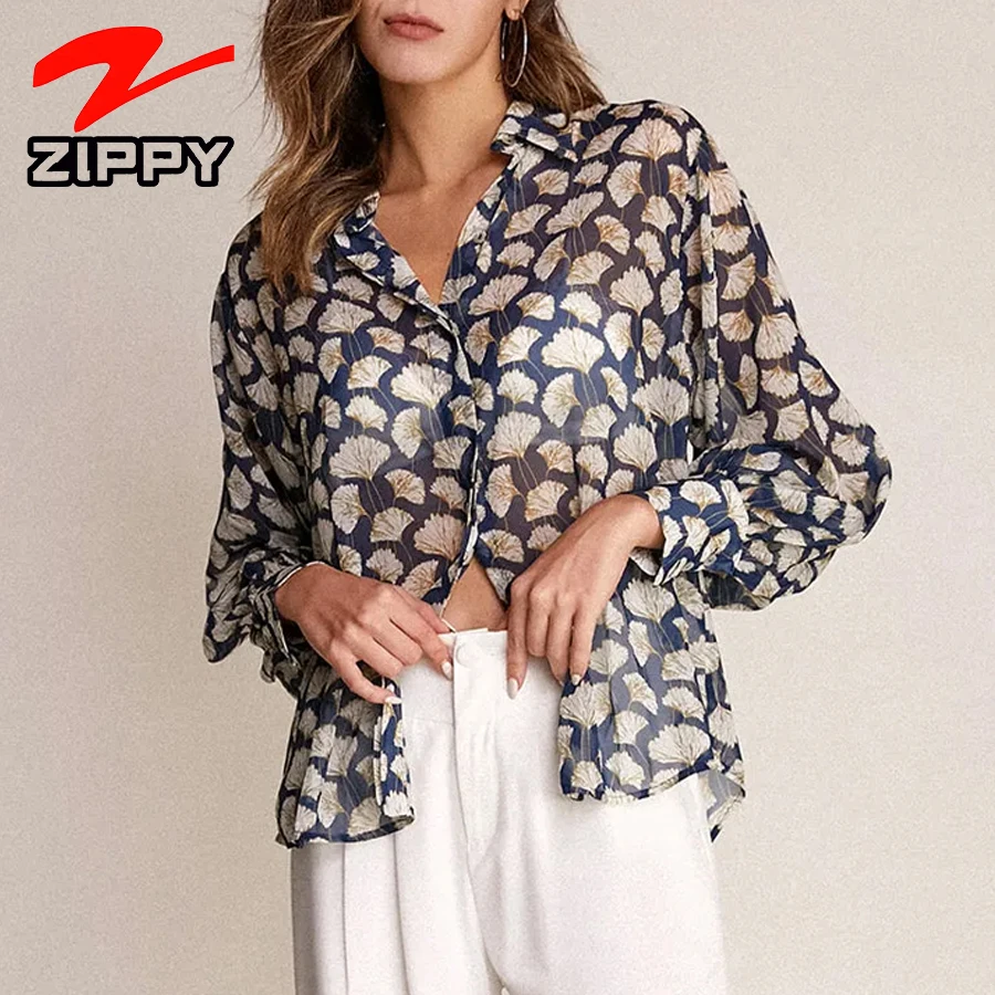 OEM Customize High Quality Retro Print Long Sleeve Blouse Elegant Temperament Summer Vacation Daily Casual Button-Up Shirt