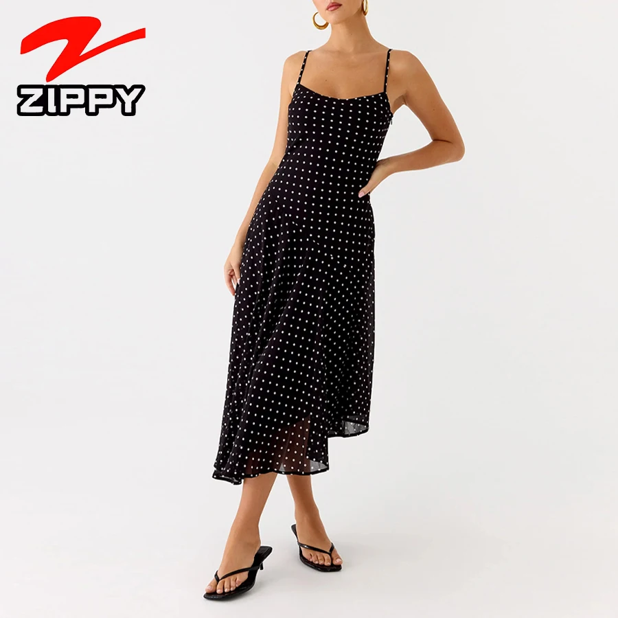 Custom Polka Dot Asymmetrical Hem Design Midi Dress Casual Summer Vacation Slip Dress Elegant Retro Minimalist Chic Daily Dress