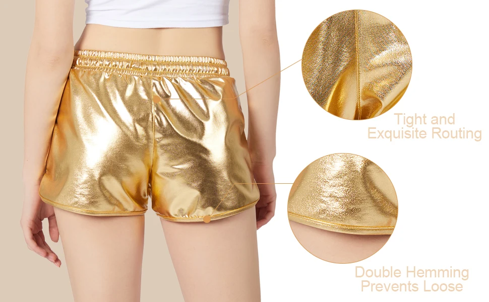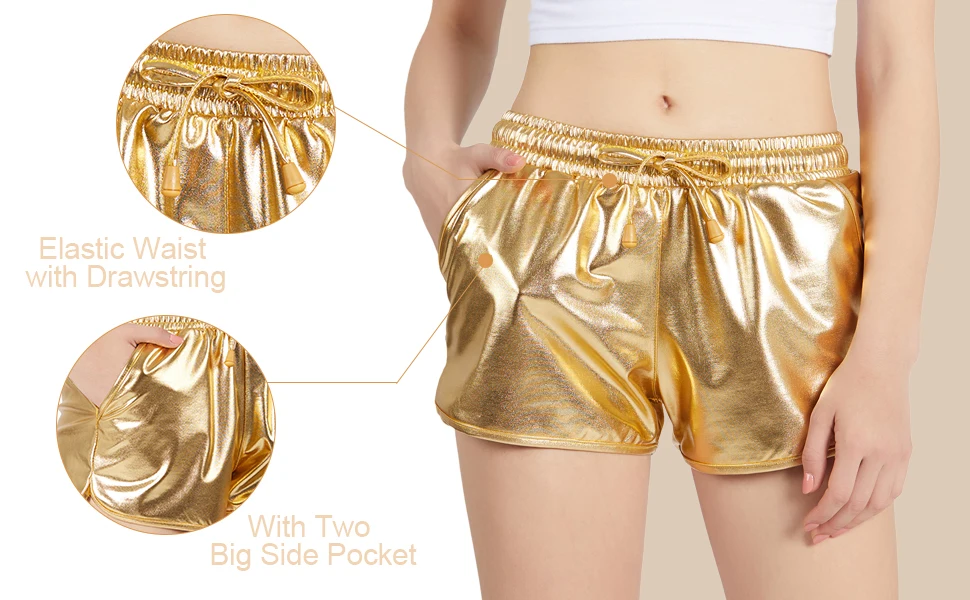 Y2K Women's Gold Shiny Metallic Shorts Elastic Waist Drawstring Y2K Aesthetic Party Shorts