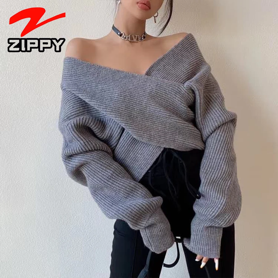 OEM Customize Autumn Grey Off Shoulder v Neck Oversized Casual Sweater Cross-front Ribbed Knit Top for Women Ladies