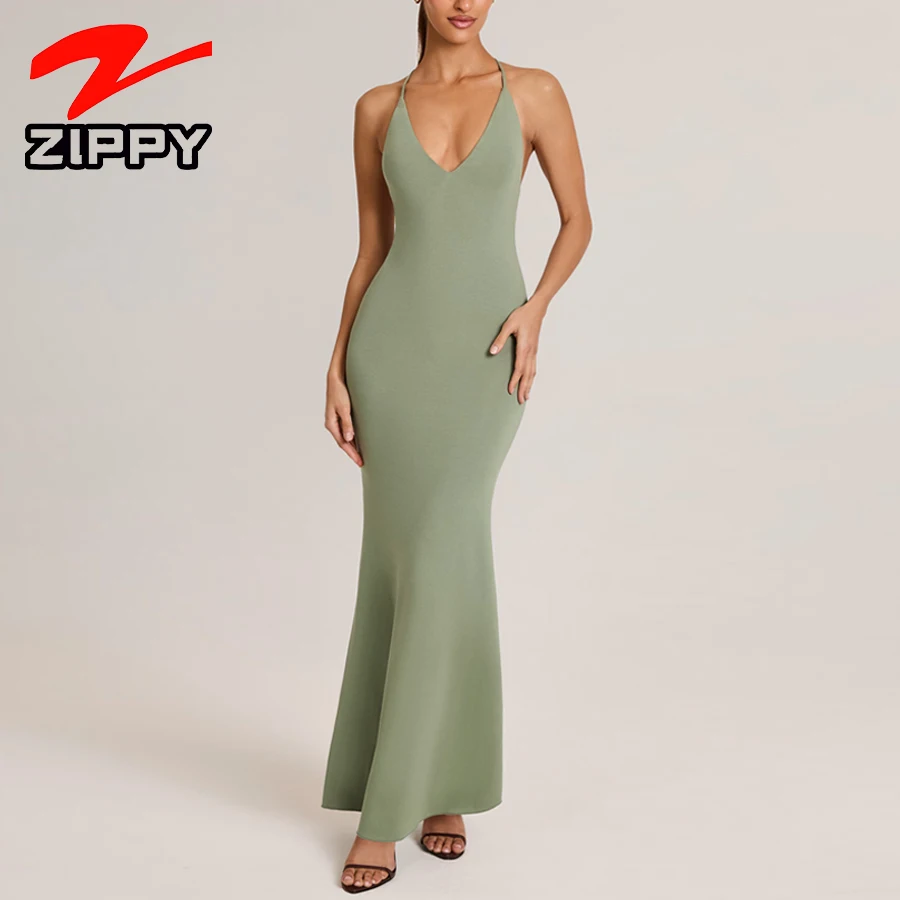 ZIPPY OEM Custom Sexy Deep V-Neck Backless Maxi Dress Simple Temperament Elegant Bodycon Mermaid Silhouette Long Dress