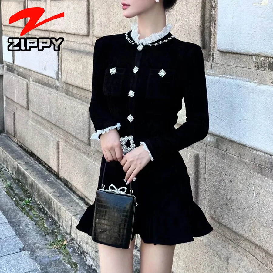 ZYHT 21541 Wholesale Crew Neck High Waist Casual Dresses Elegant Lace Velvet Mermaid Hem Ruched Long Sleeve Dresses for Women