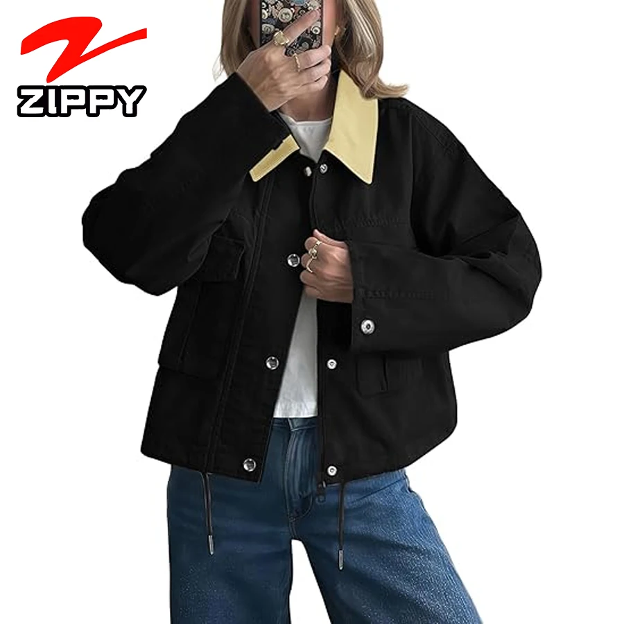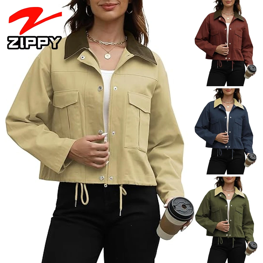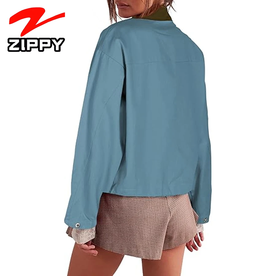 OEM Custom High Quality Cropped Jacket Zip up Lightweight Bomber Button Drawstring Oversized Utility Casual Coats With Pockets