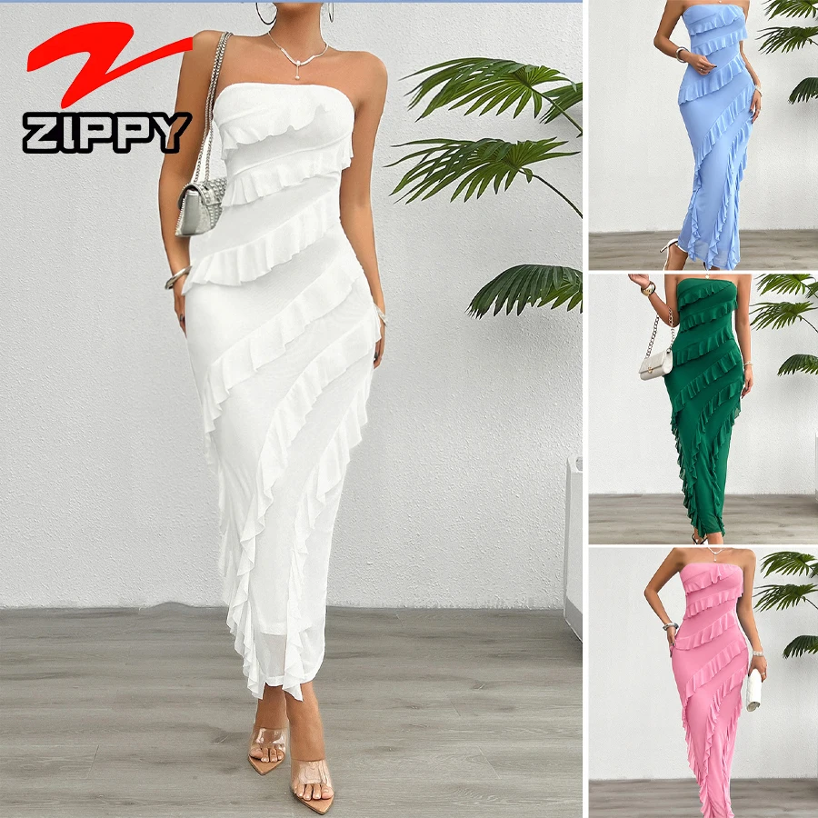 OEM ZIPPY Custom High Quality Fashion Strapless Ruffle Mesh Maxi Dress Bodycon Back Slit Design Elegant Beach Long Dress