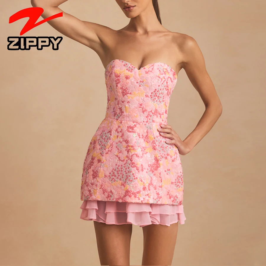 ZIPPY Customize Women Fashion Strapless Sequin Mini Dress Sweetheart Neckline Sexy Back Lace-Up Design Ruffled Hem Short Dress