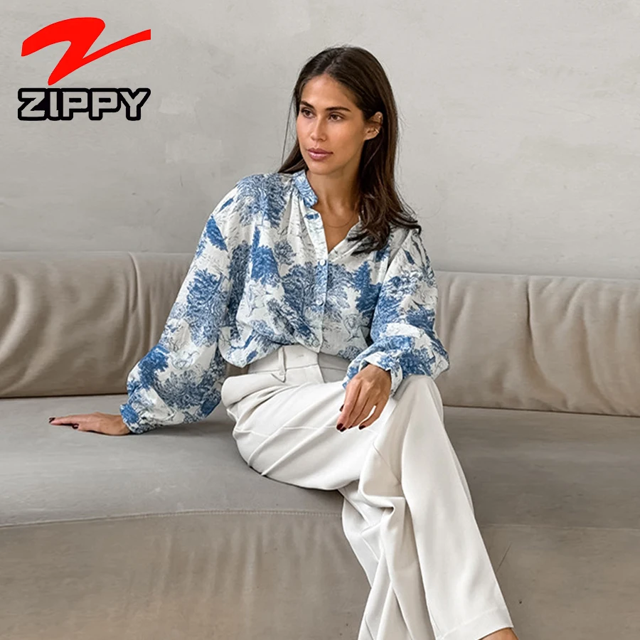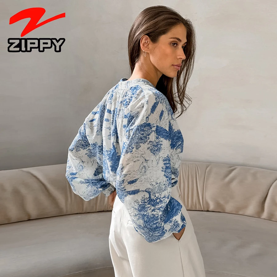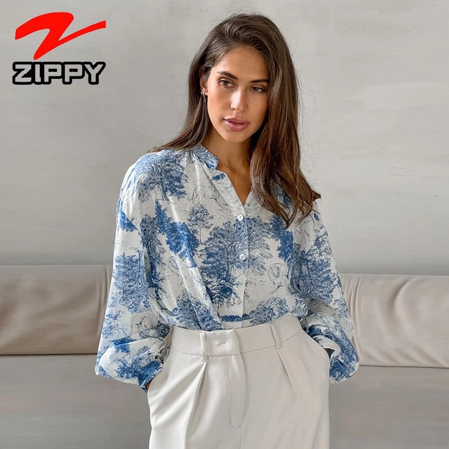 Customize Fashion Floral Print Shirt Lantern Long Sleeve V-Neck Loose Casual Top Simple Elegant Temperament Blouse