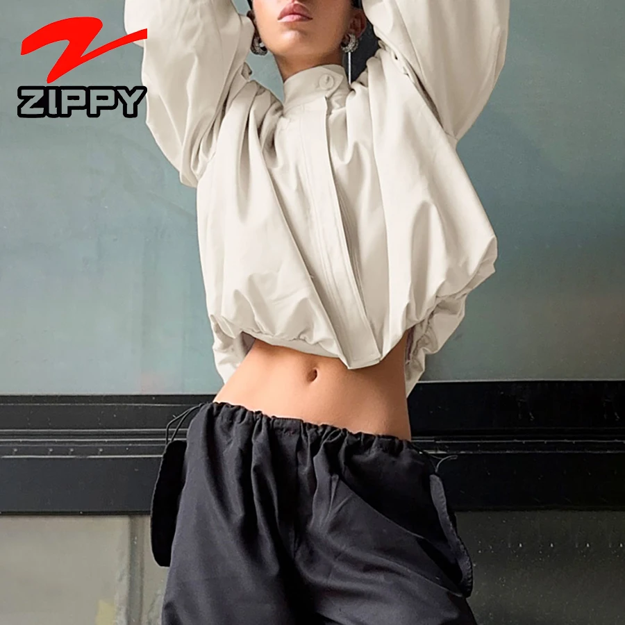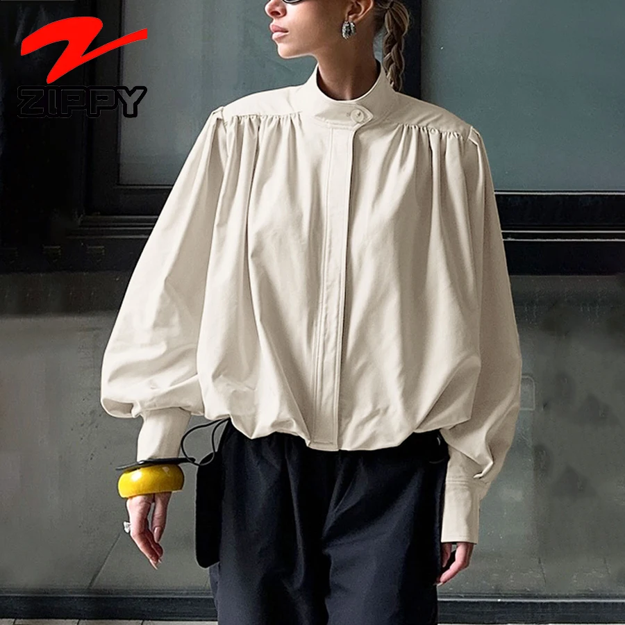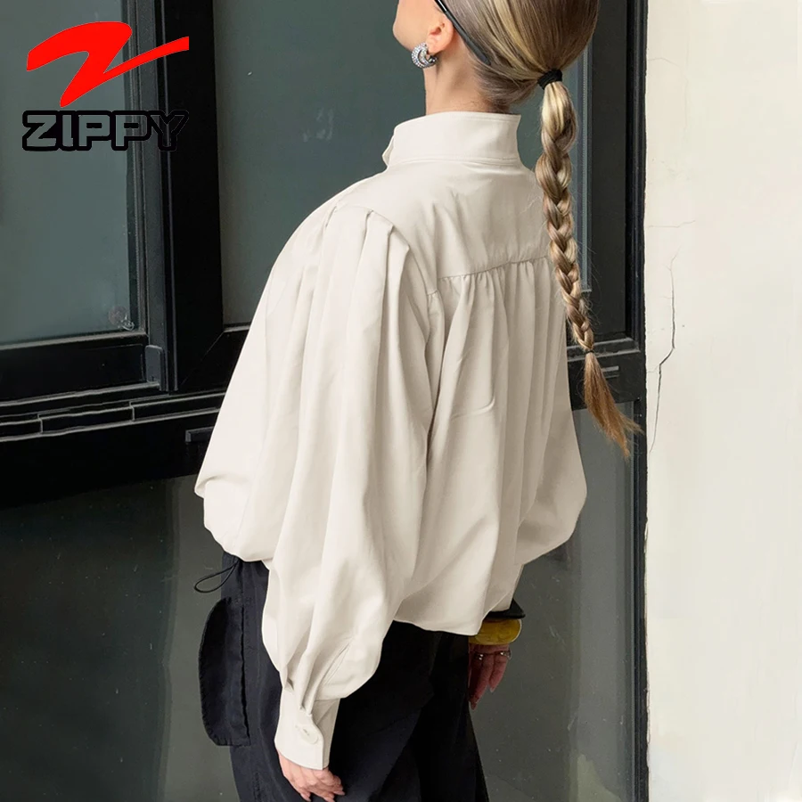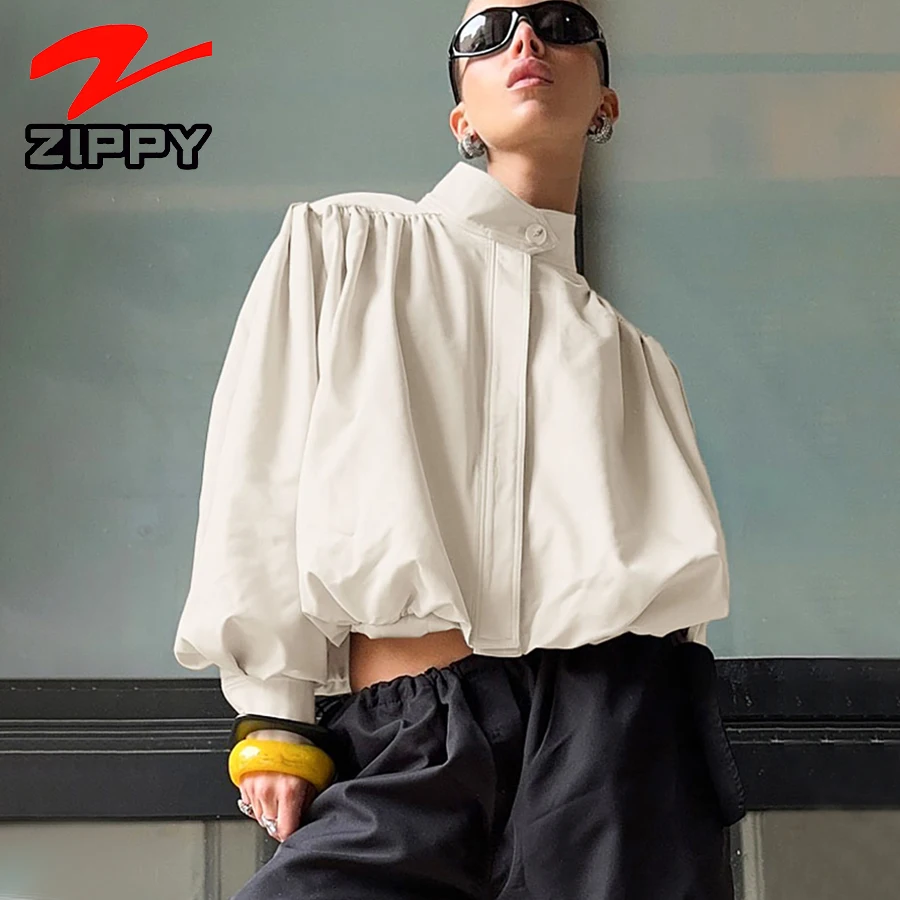 ZIPPY Customize Fashion Stand Collar Lantern Sleeve Loose Coat Temperament Elegant Solid Color Casual Fashion Coats