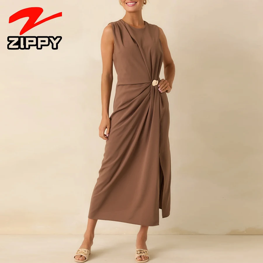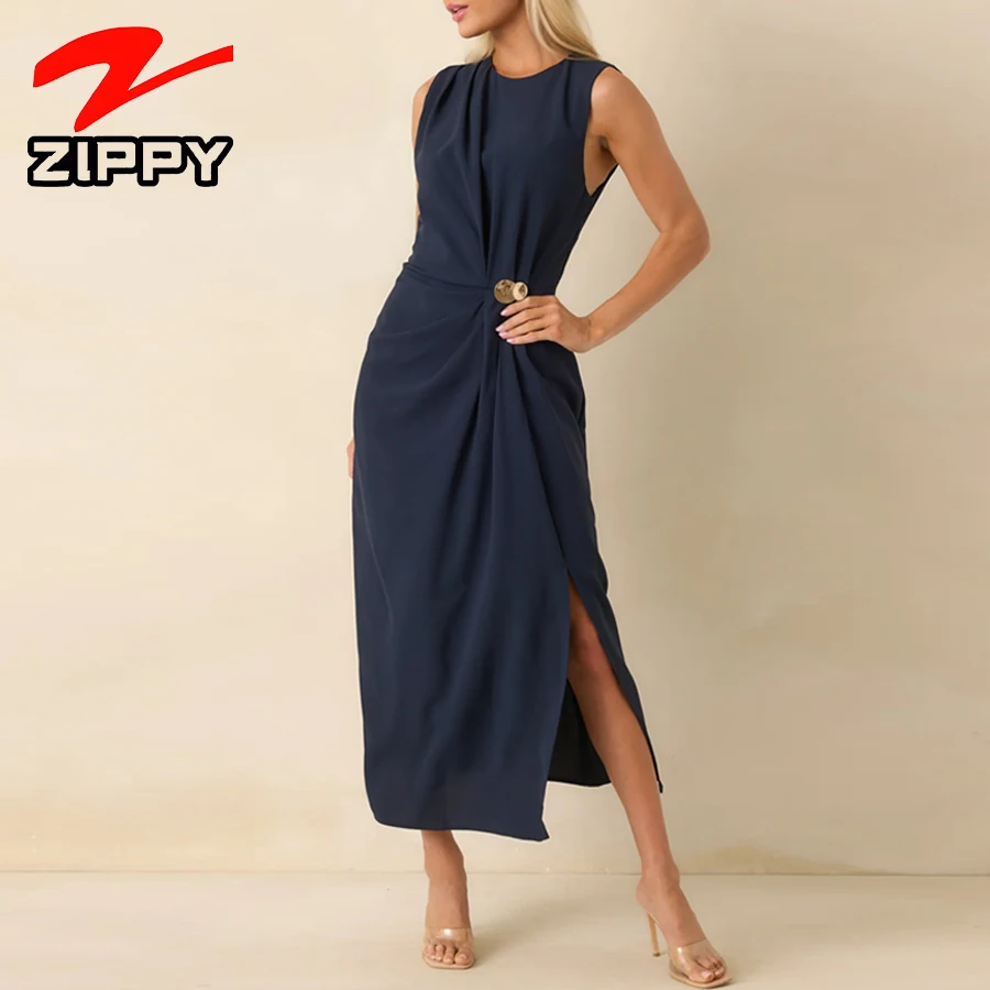 Customize Women Fashion Simple Sleeveless Midi Dress Solid Color Side Slit Design Temperament Elegant Casual Dress