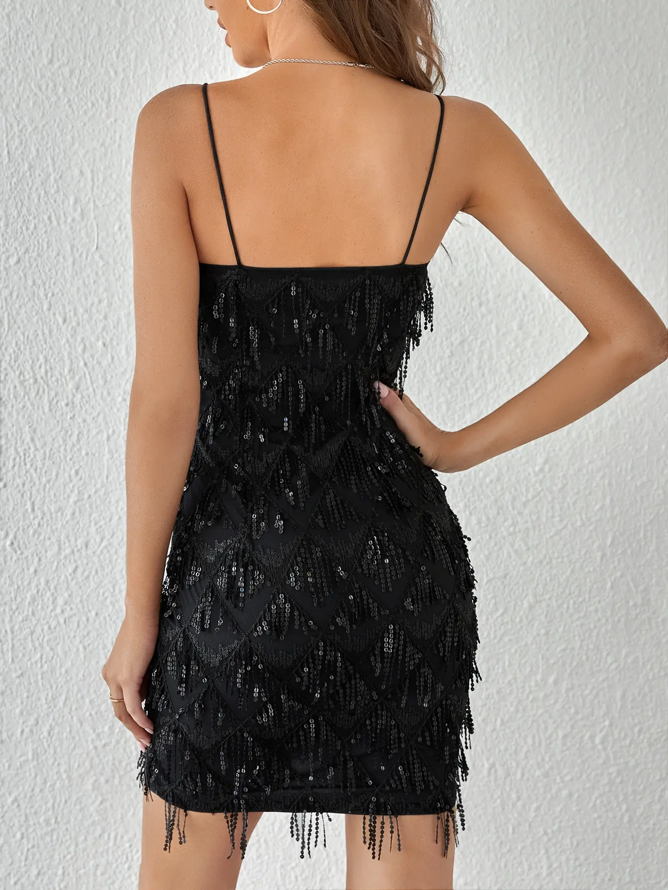 Elegant Tassel Women Dress Halter Backless Mini Dress Sexy Fringe Trim Bodycon Sequin Cami Dress