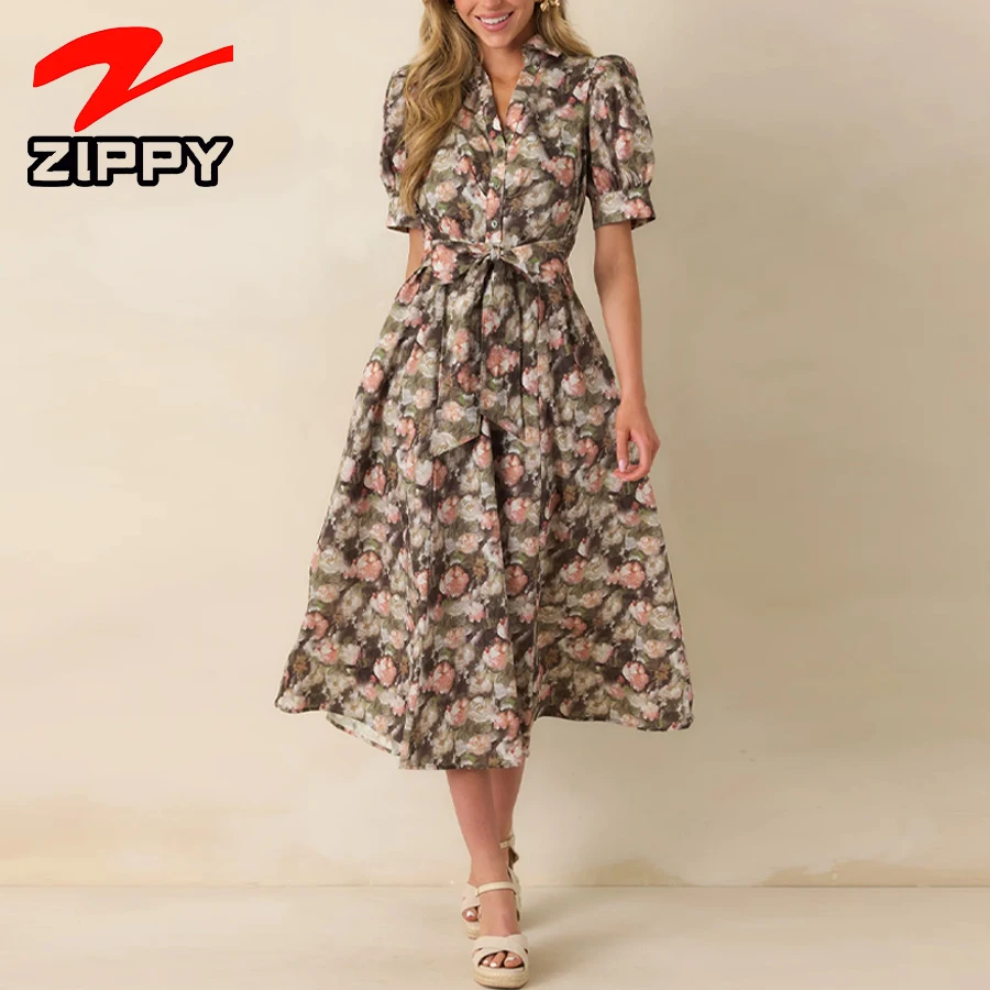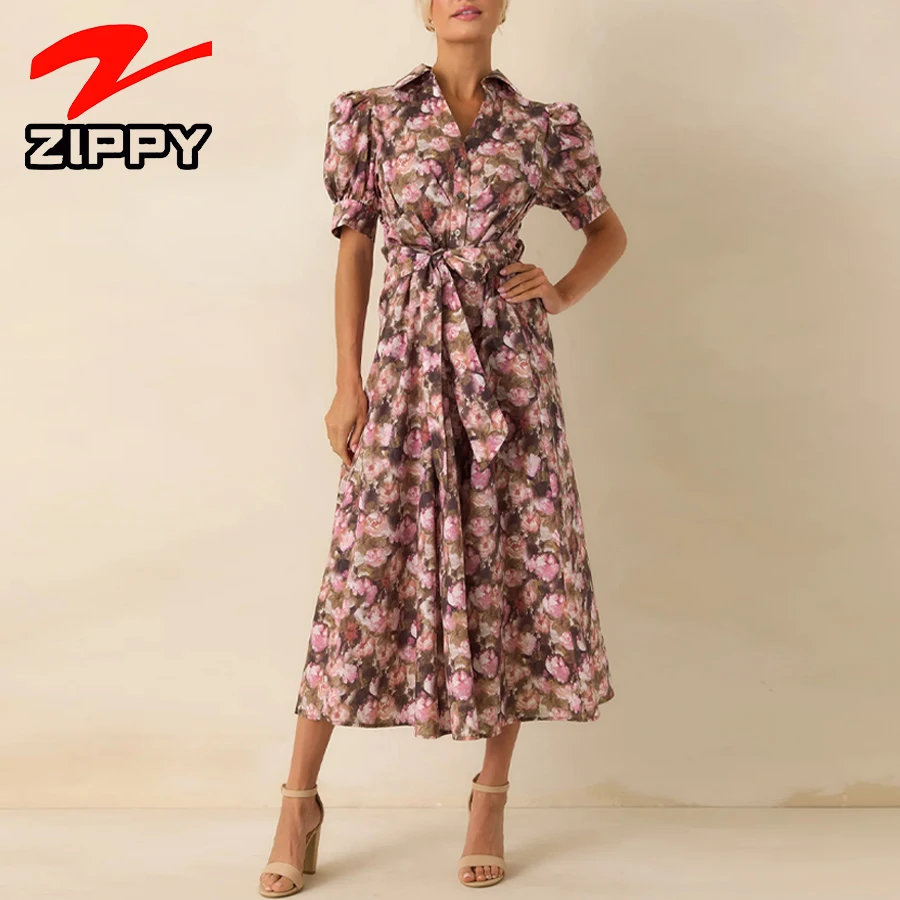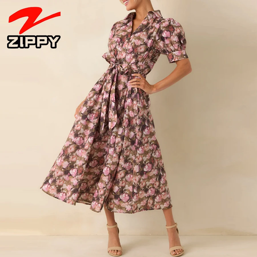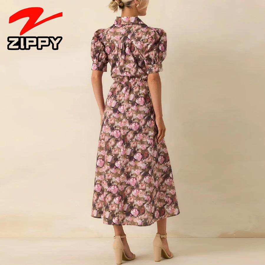 Customize Women Fashion Floral Print Midi Dress Puff Sleeve Elegant A-Line Dress Casual Daily Vacation Shirt Dress