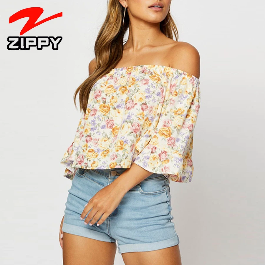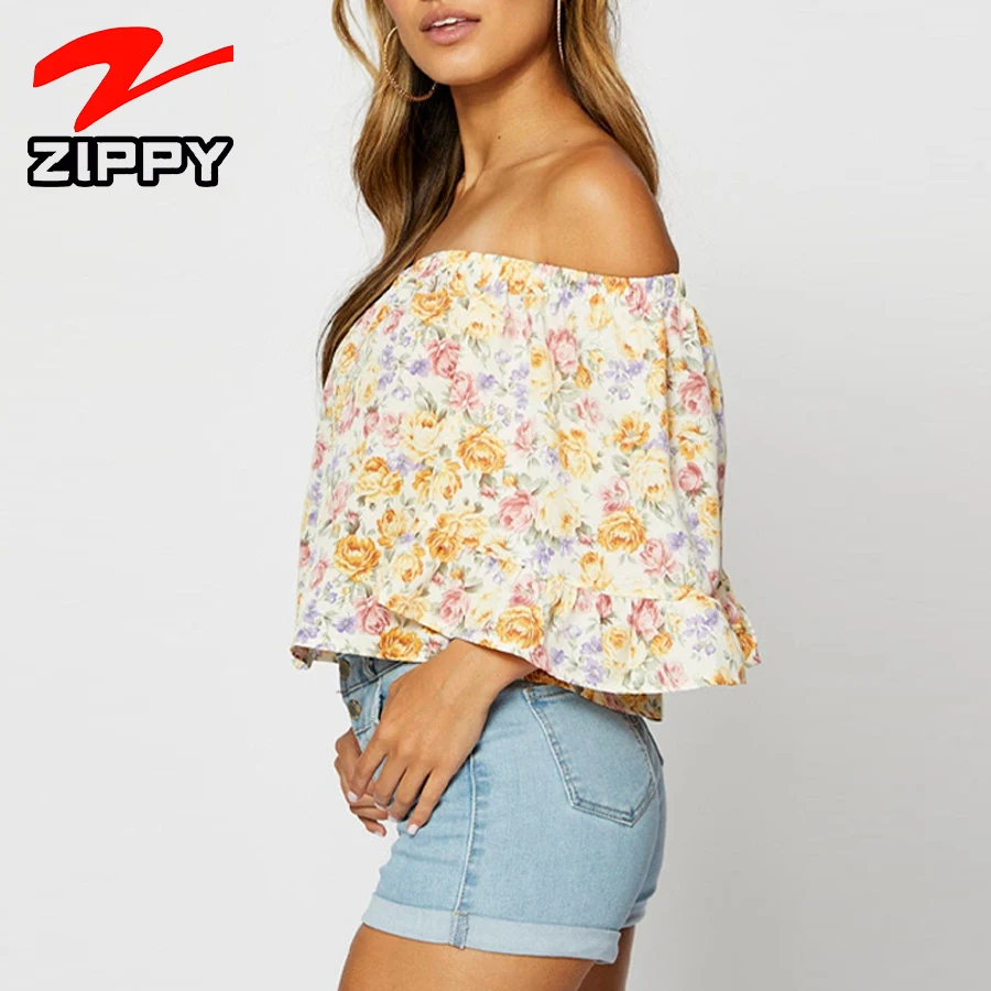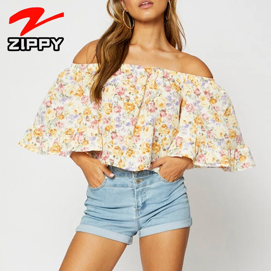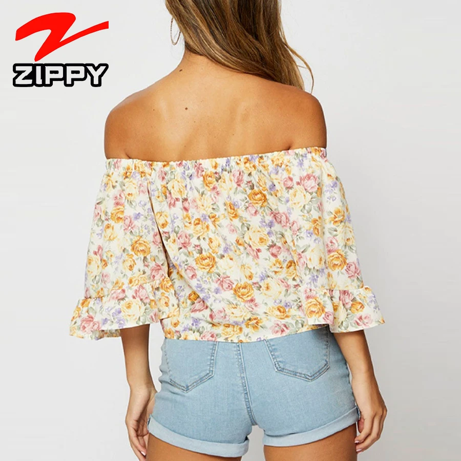 ZIPPY Customized Women's Off-Shoulder Floral Print Ruffle Sleeve Top Summer Casual Loose Blouse Elegant Simple Half Sleeve Shirt