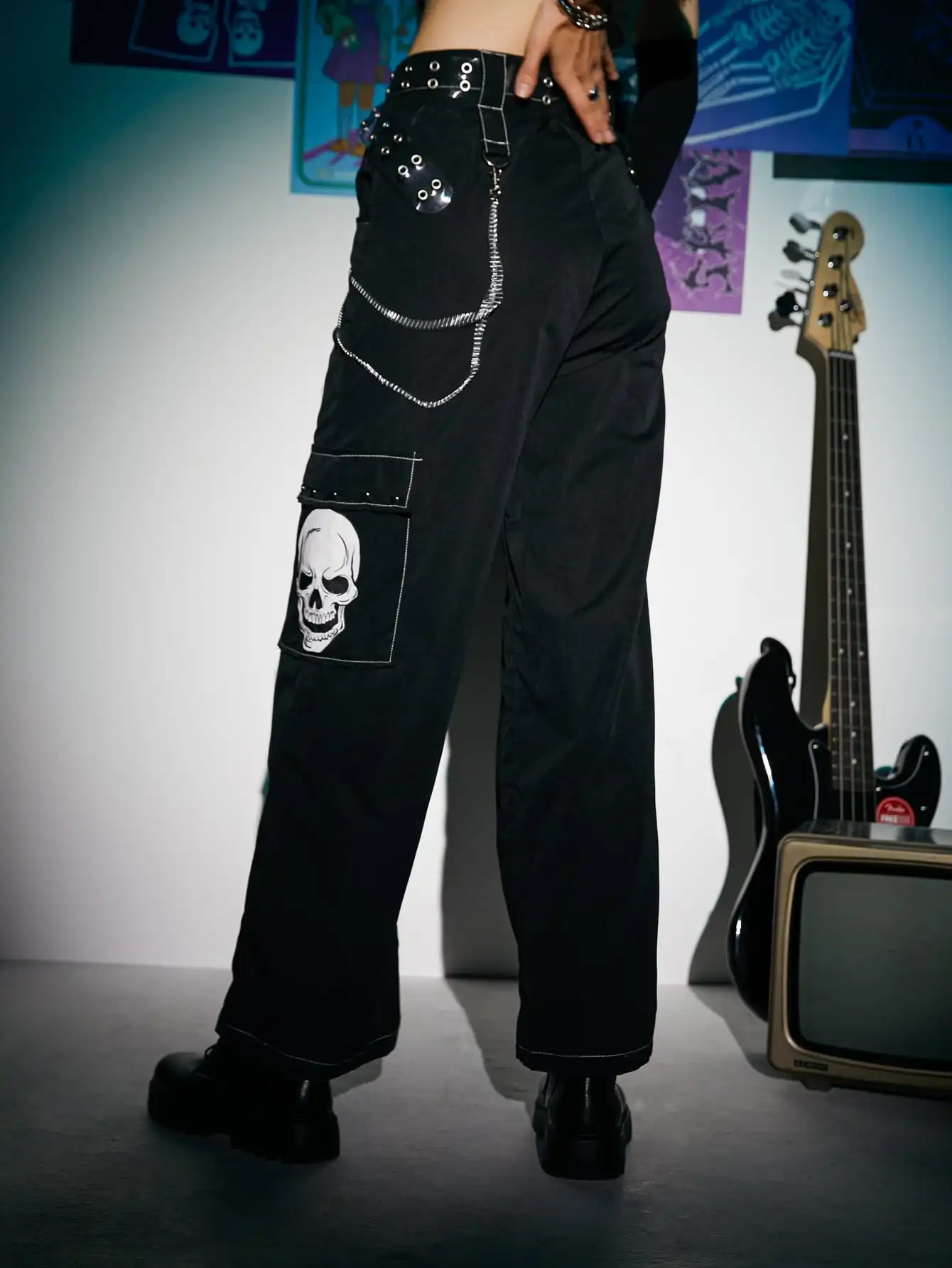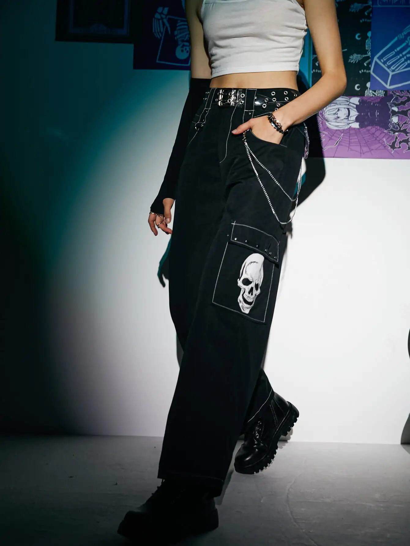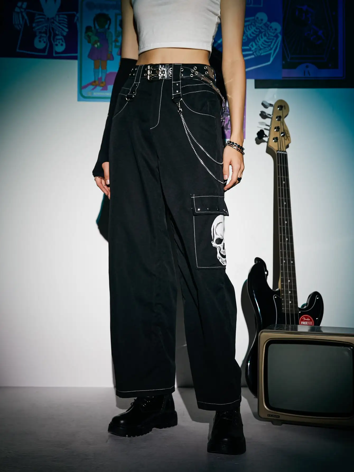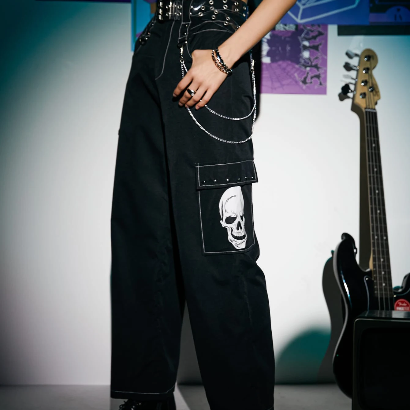 New Design Custom High Waist Cargo Pants Women Streetwear Black Grunge Punk Skull Graphic Contrast Binding Pants