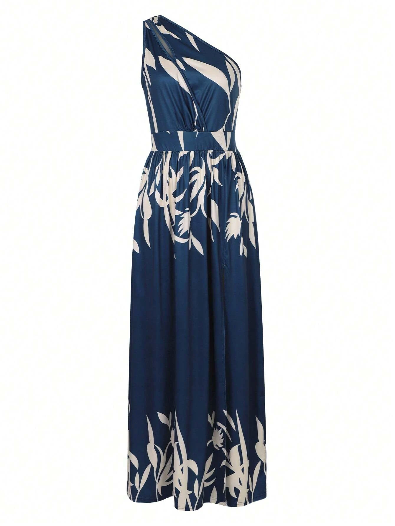Side Slit Hollow Printed Long Evening Dress One Shoulder Oblique Neck Floral Print Slit Hem Long Dress
