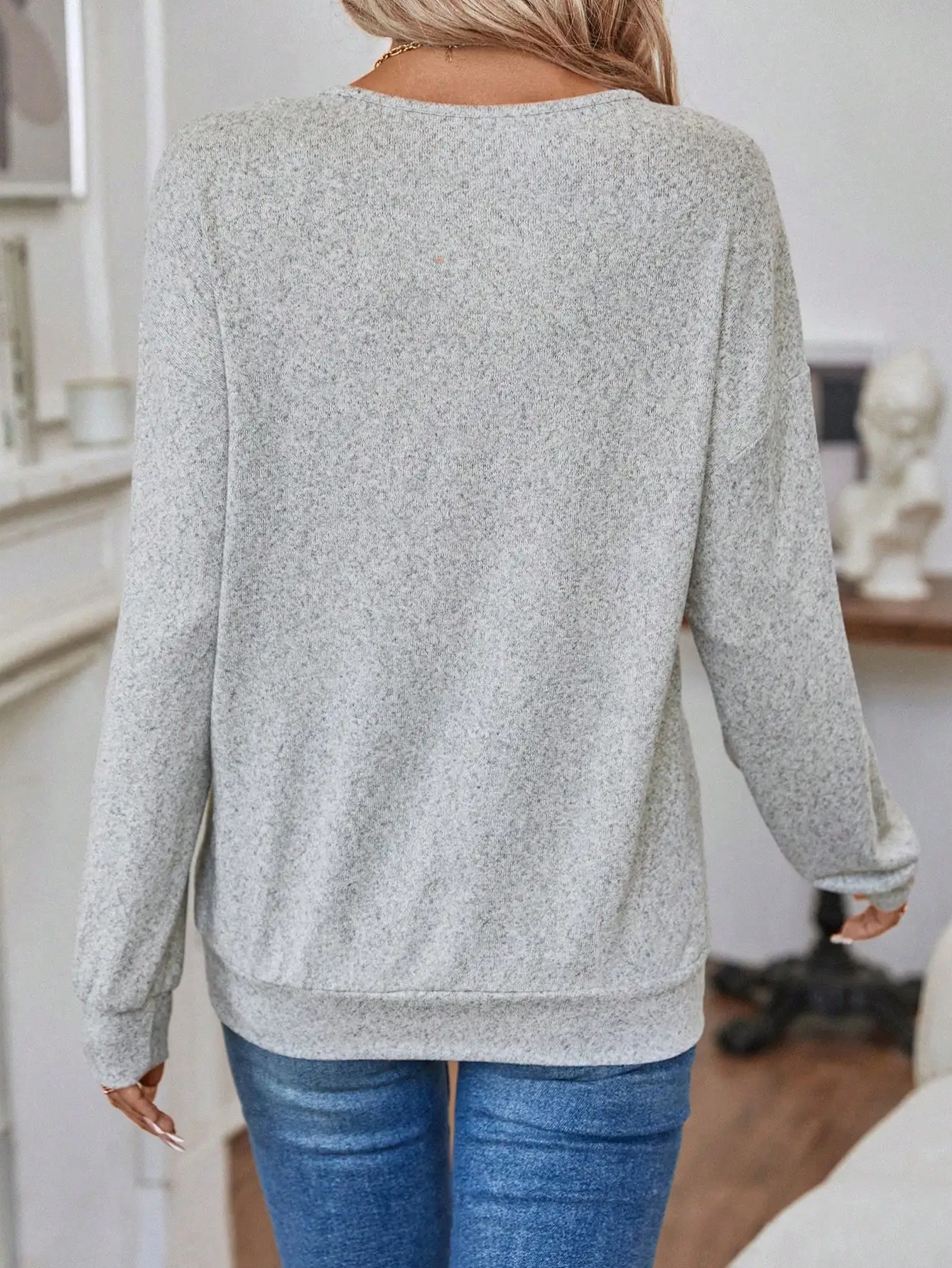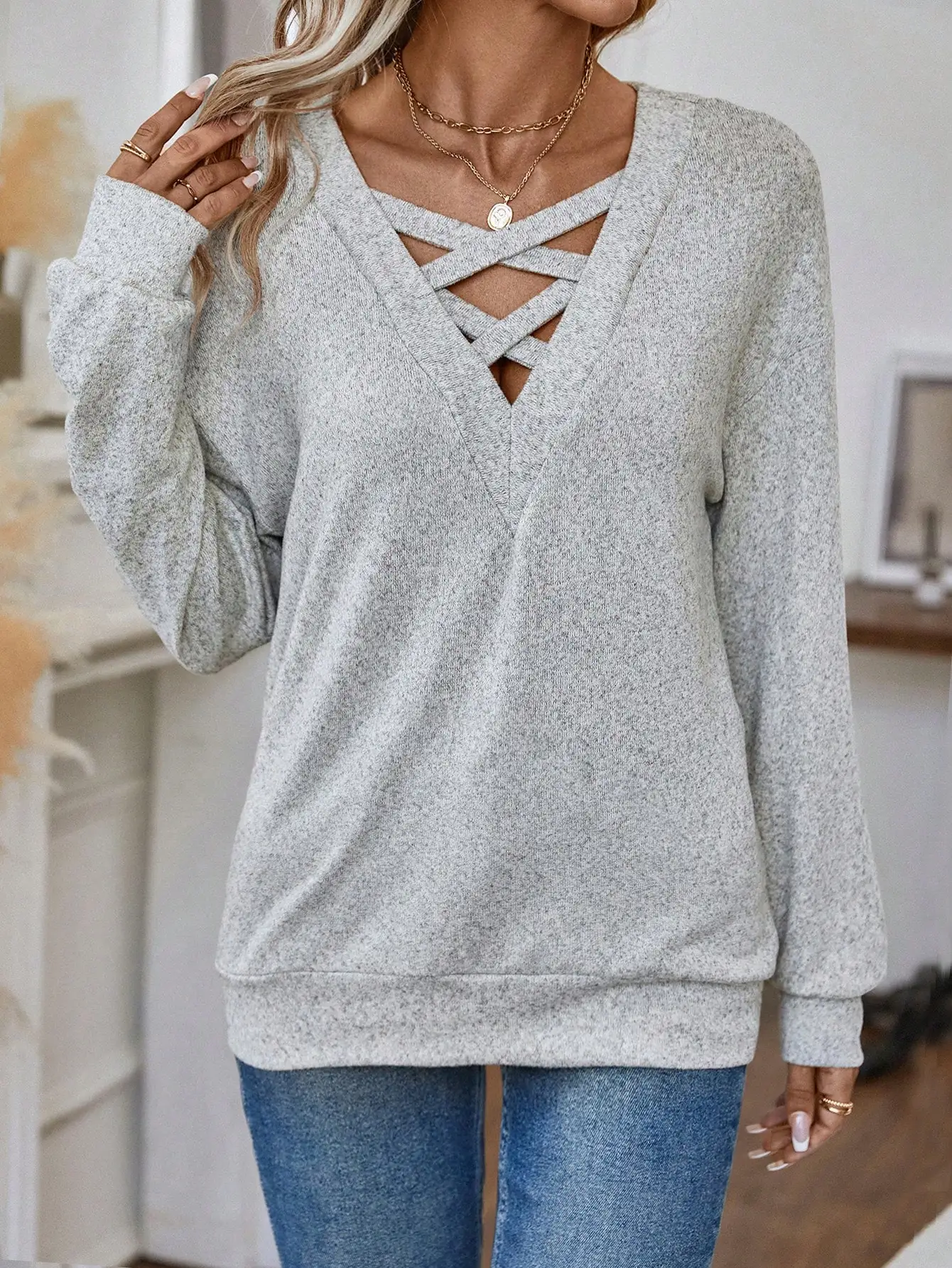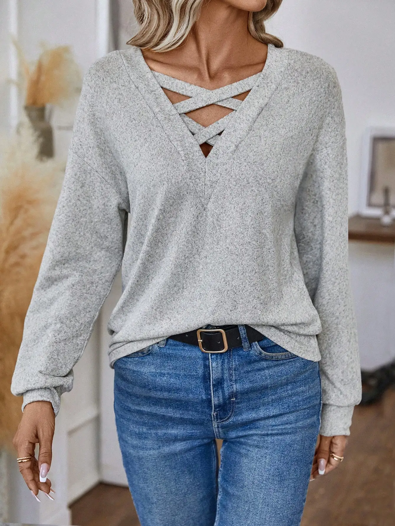 New Arrivals Women's Lightweight Long-Sleeves V Neck Loose Pullover Knit Crisscross Drop Shoulder Sweatshirt