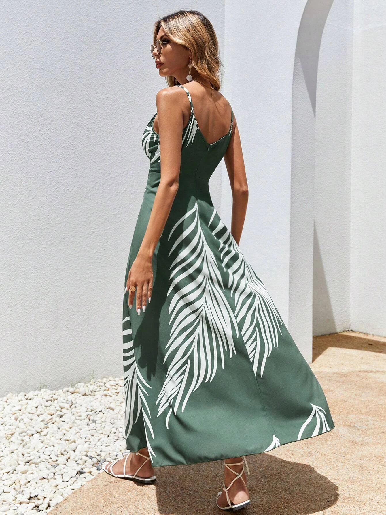 Sleeveless Backless Split Halter Maxi Wrap Dresses Tropical Print Wrap Hem Cami Dress