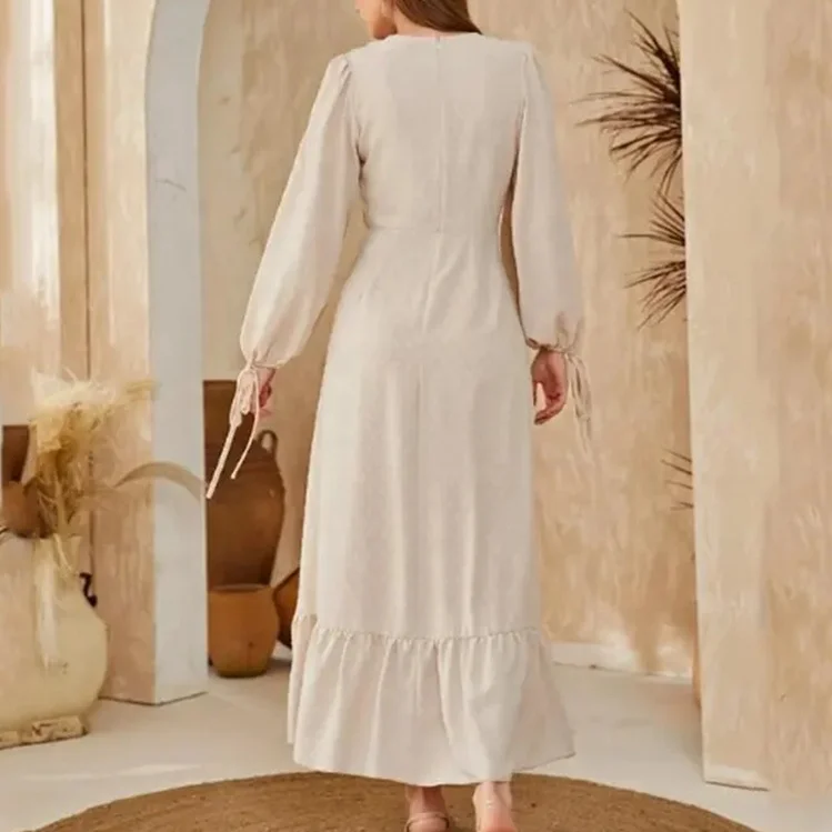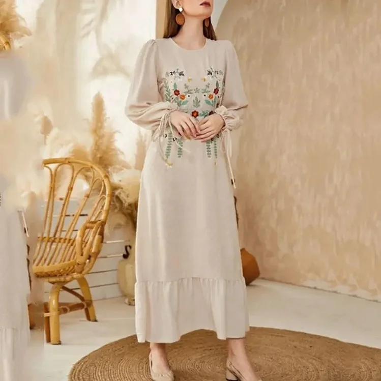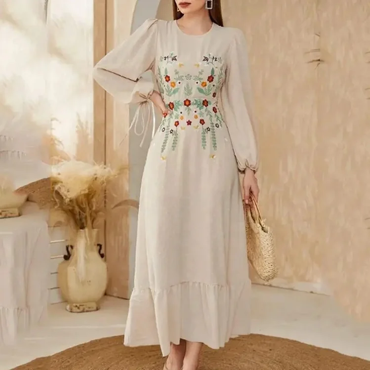 Elegant Ladies Long Sleeve V-Neck Embroidered Floral Print Long Dress Autumn Neck Waist Design Maxi Cuff Lace up Women's Dress