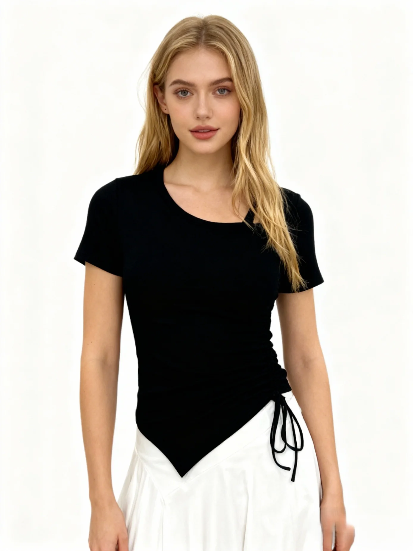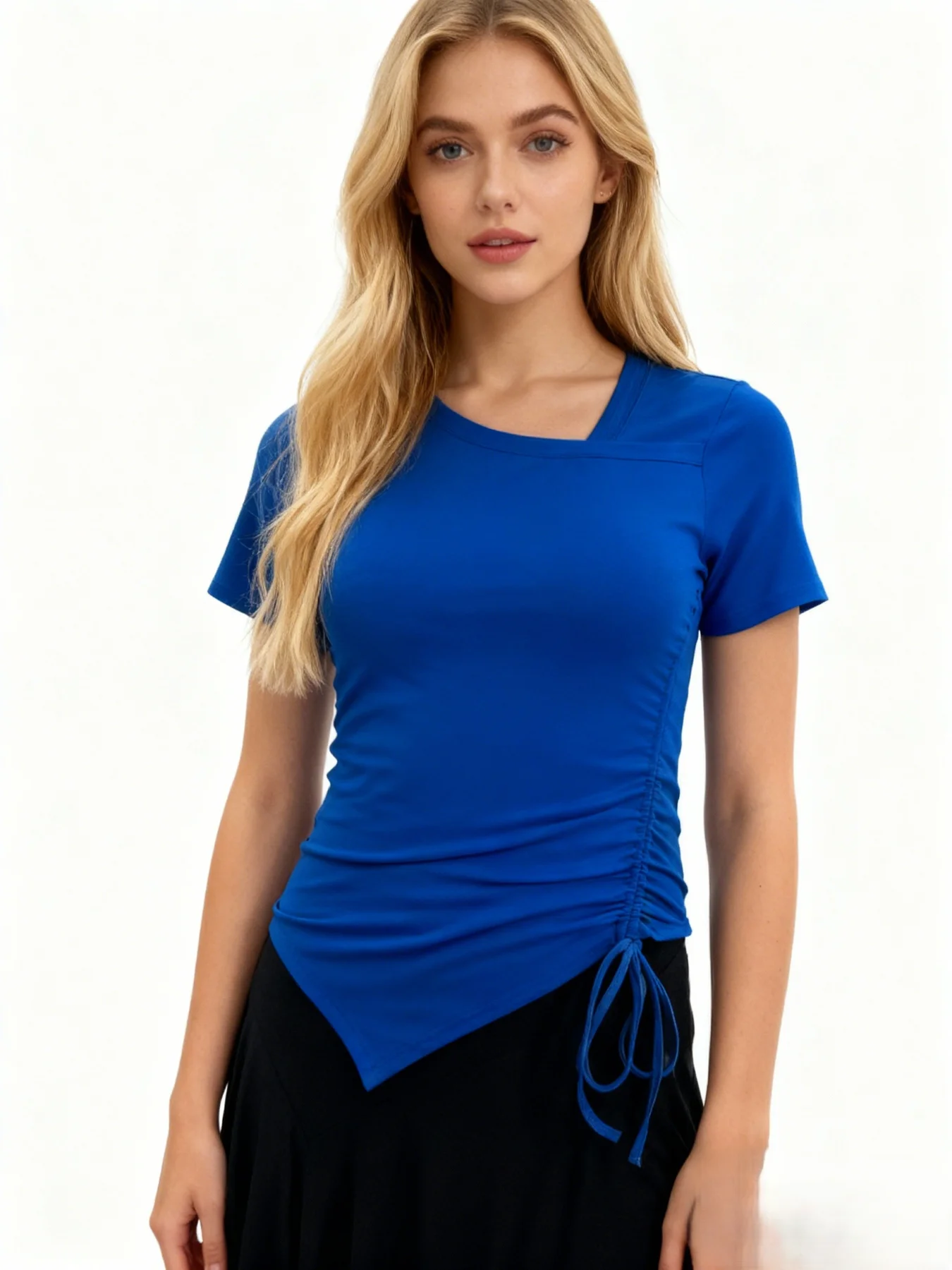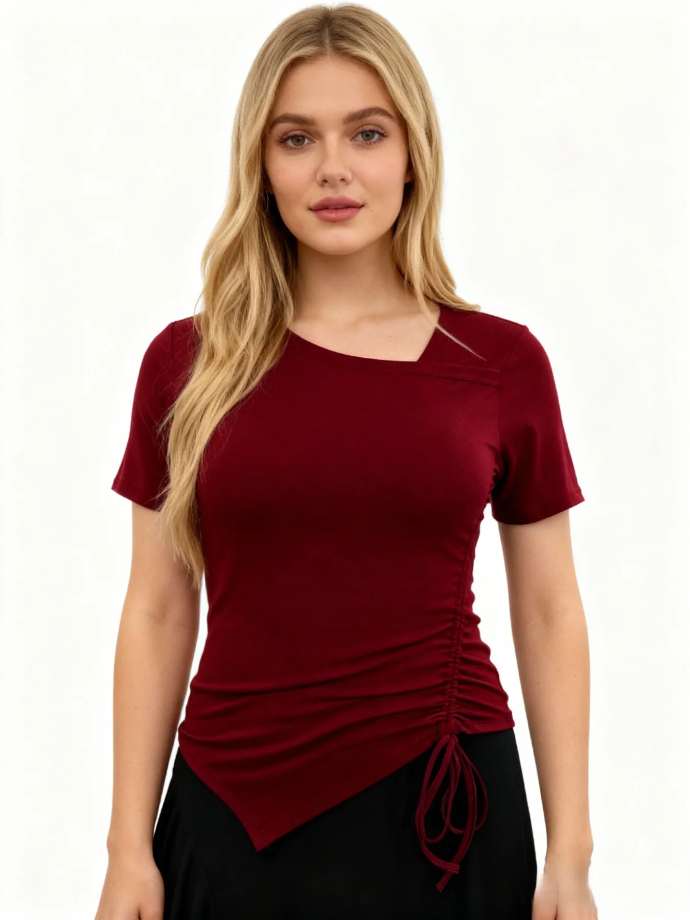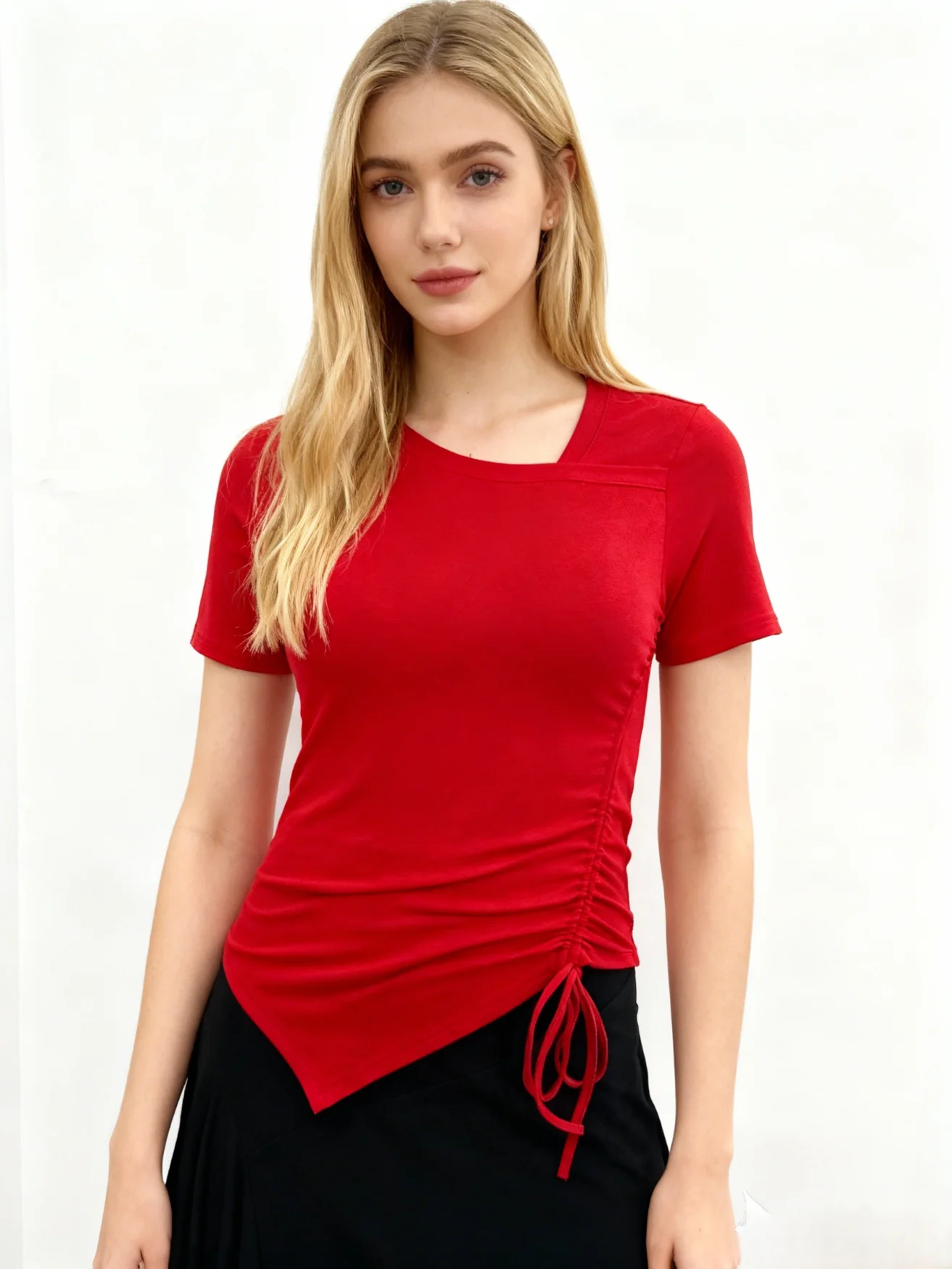 Popular Asymmetrical Elegant Stretch Cropped Shirts Slim Fit Tie Ruched Shirring Short Sleeves Tops