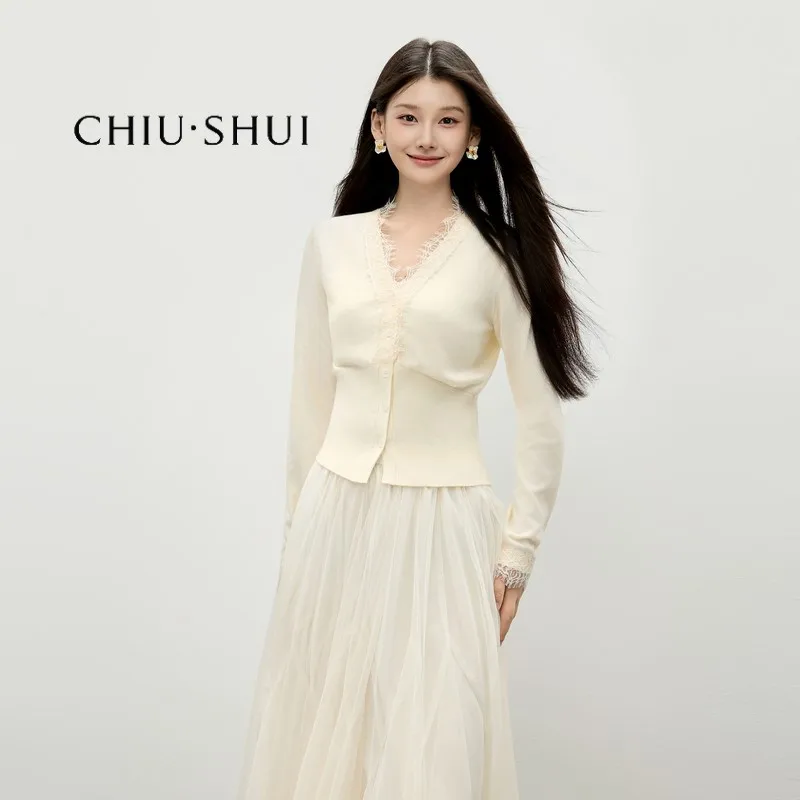 Women's Lace Knitted Cardigan Autumn New Arrival Gentle French Style with Elegant V Neck Soft Skin Friendly Fabric