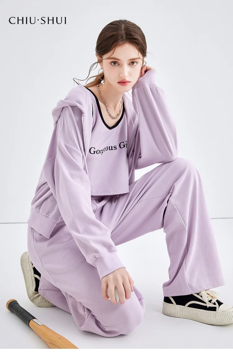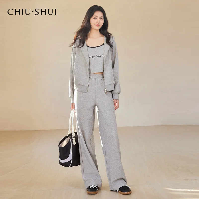 Trendy Women's 3 Piece Loungewear Set Gray Hoodie Crop Top Wide Leg Pants Casual Sports Suit for Women Woman Design Clothing
