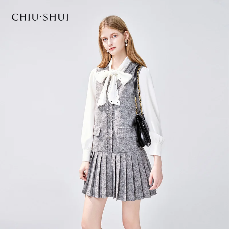 Women's Casual Temperament Academy Style Pleated Vest Dress Woven Shirt Dress Suit