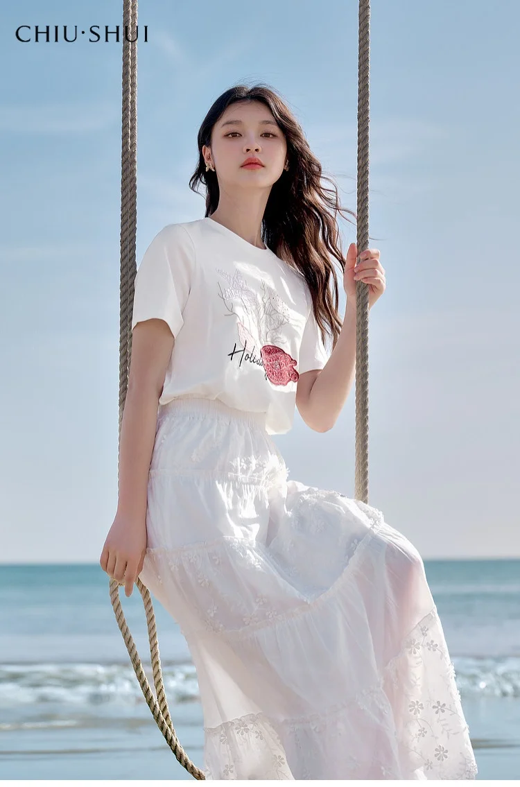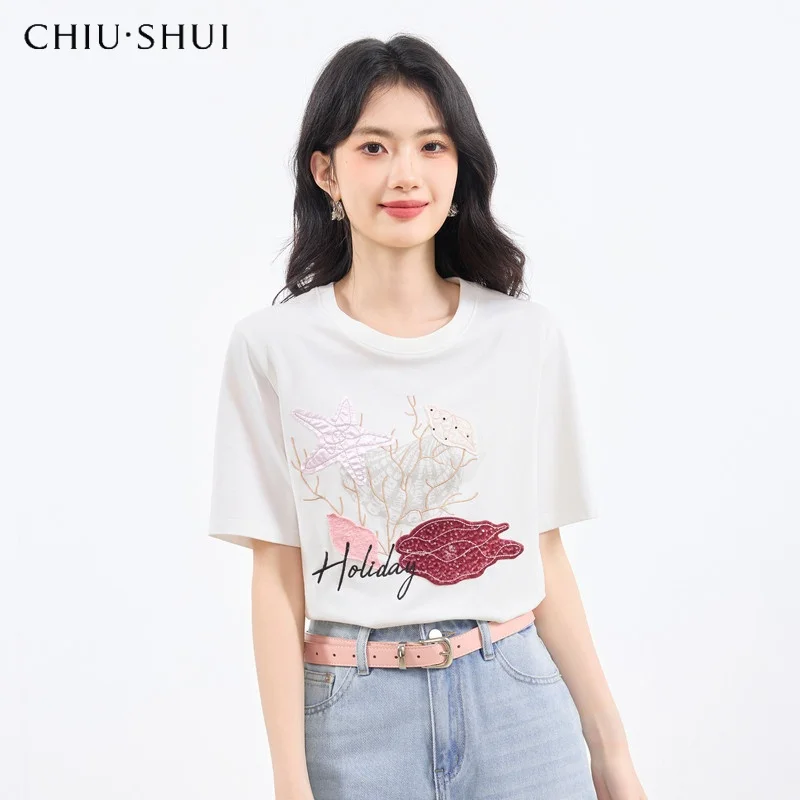 Women's Casual Embroidered Crew Neck Short Sleeve T-shirt 100% Cotton Animal Shell Pattern Loose Fit