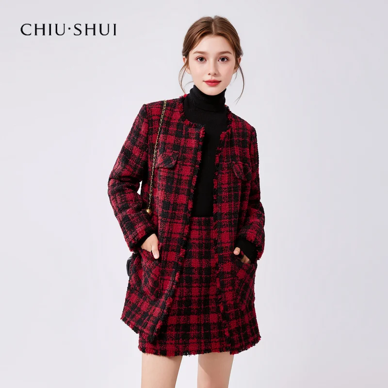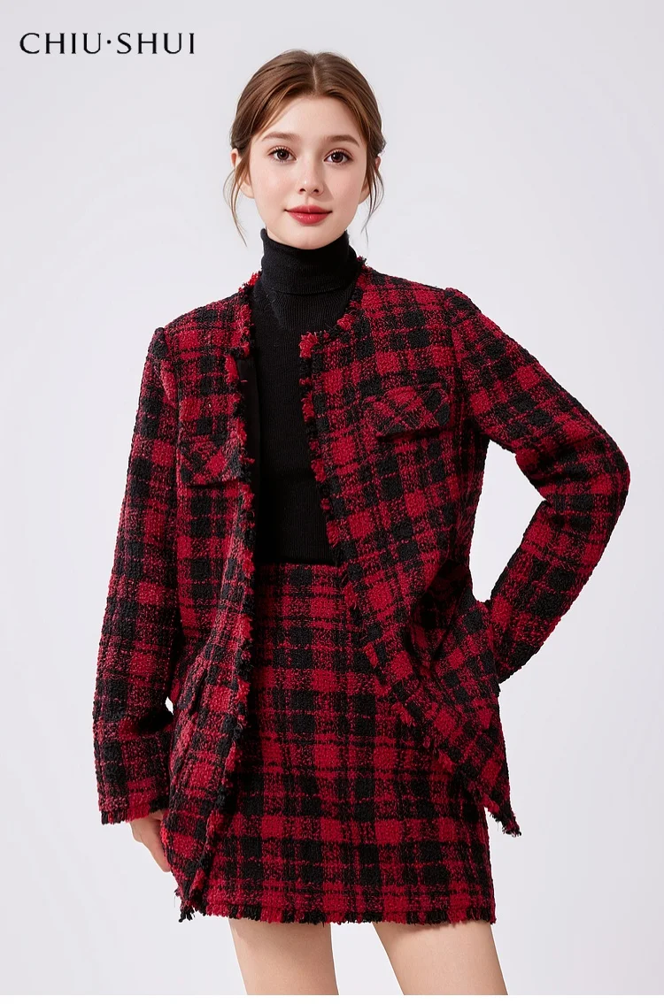 Winter New Women's Sheep Wool Style Casual Plaid Jacket Skirt Two-Piece Set Worested Fabric