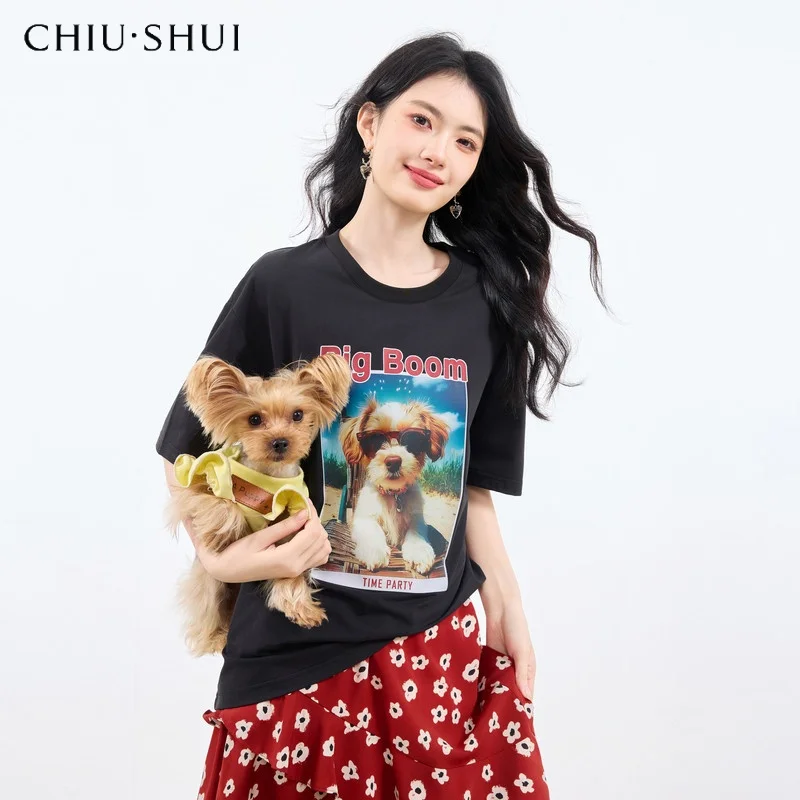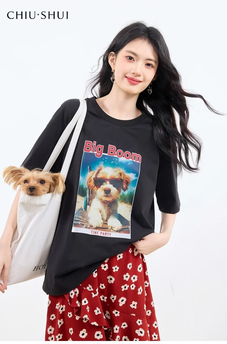 Printed Simple Straight Shoulder Neck T-shirt Summer New Women's Daily Commuter Style H-shaped Short Sleeve
