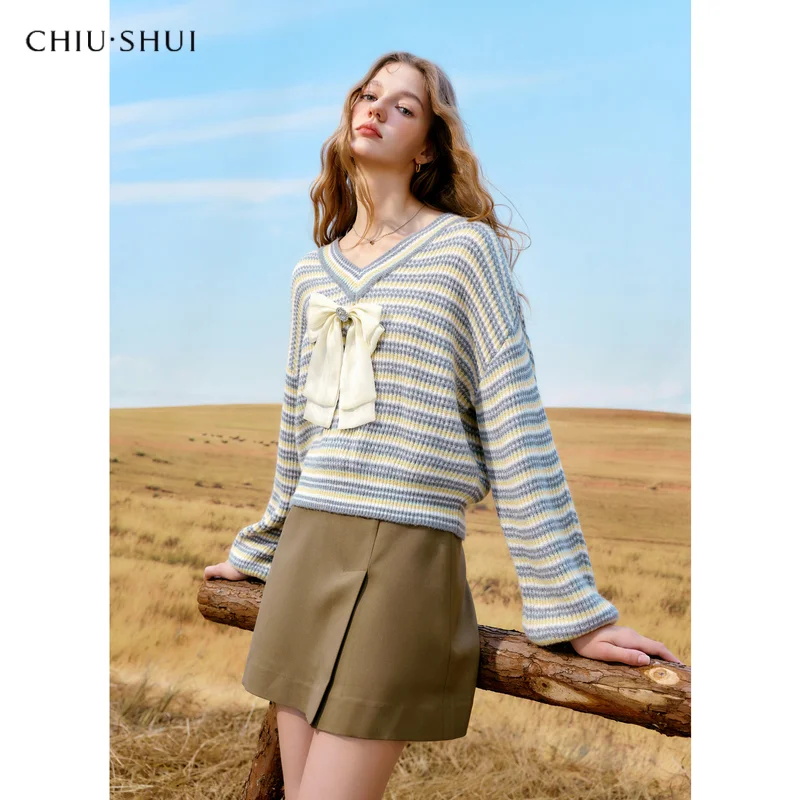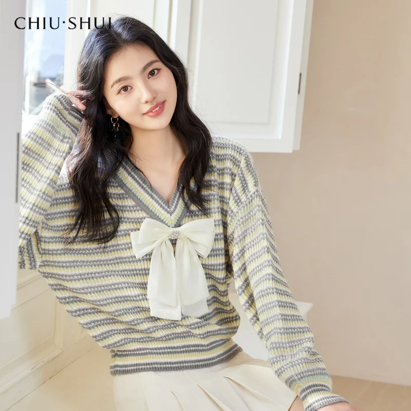 Women's New Korean Sweet Bow Striped Sweater Loose V-Neck Knitted Long Sleeved Top for Autumn Winter Front