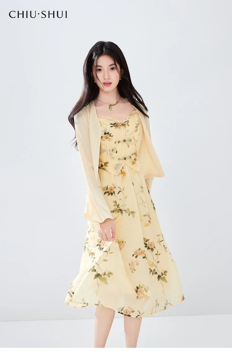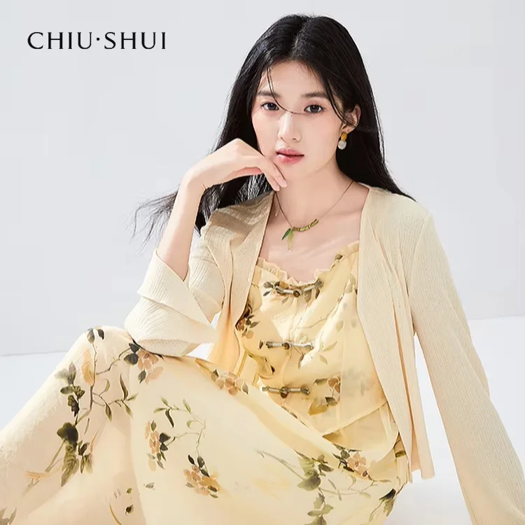 New Women's Guofeng Jacquard Dress Suit Casual Bow Collar Cardigan Slip Skirt Two Piece Set