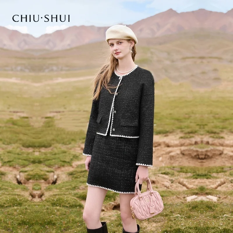 Winter New Women's Black Fragrant Style Box Jacket Vest Dress Knee Length Two Piece Set Including Top
