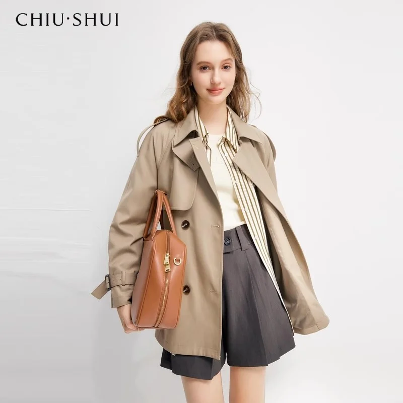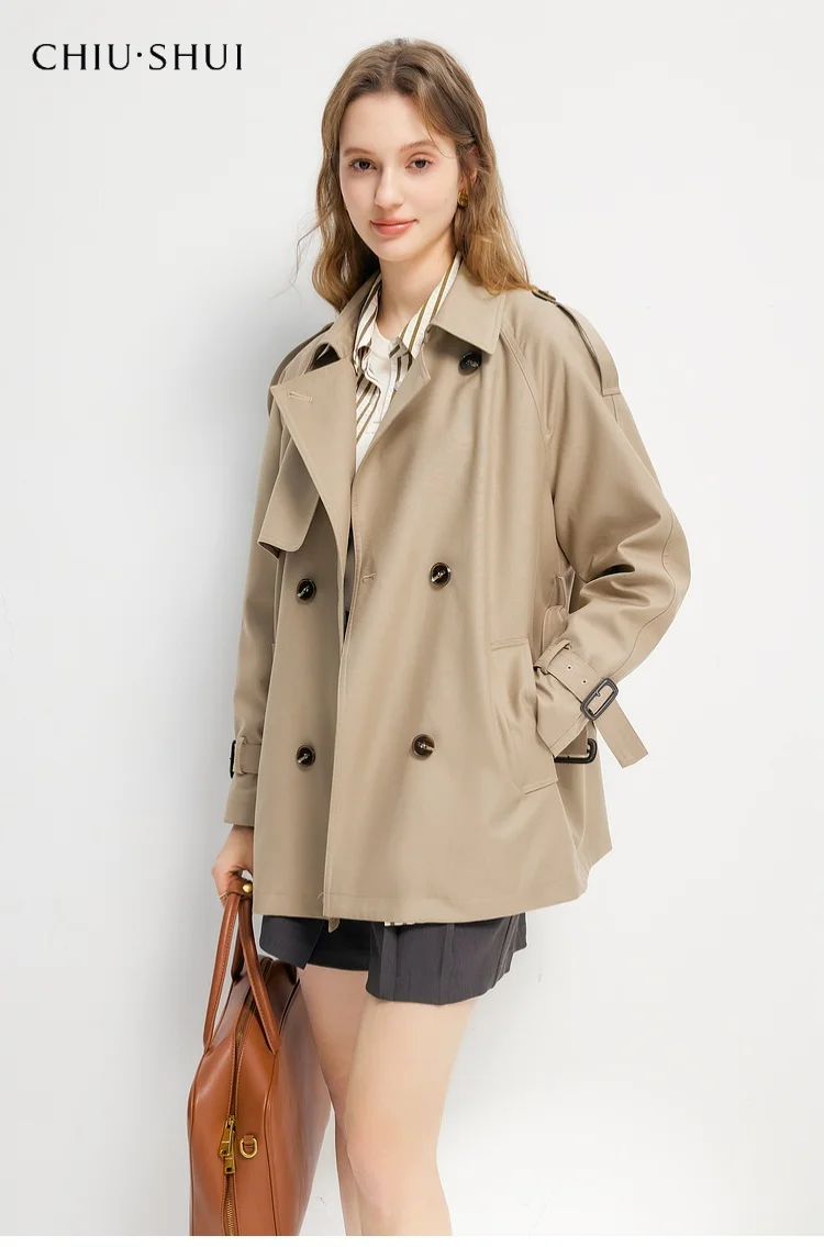 Elegant Double Breasted Short Trench Coat for Women Spring New Small Size Turn-Down Collar Fleece Lining