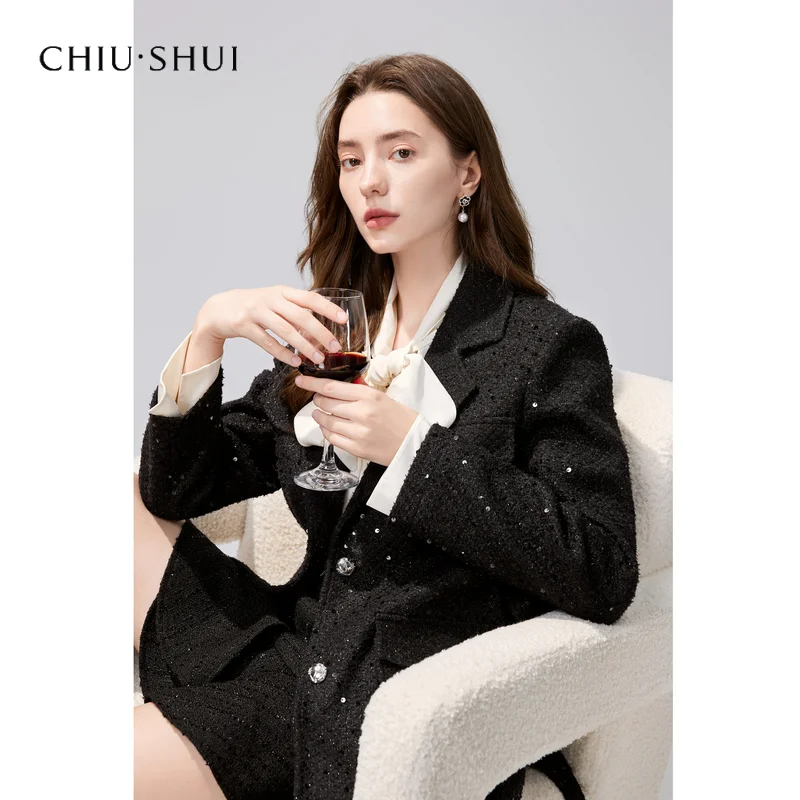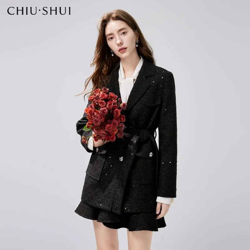 ZYHT 35239 Women's Elegant Black Velvet Blazer with White Ruffled Trim Peplum Hem & Long Puff Sleeves Chic Formal Jacket