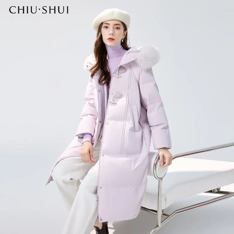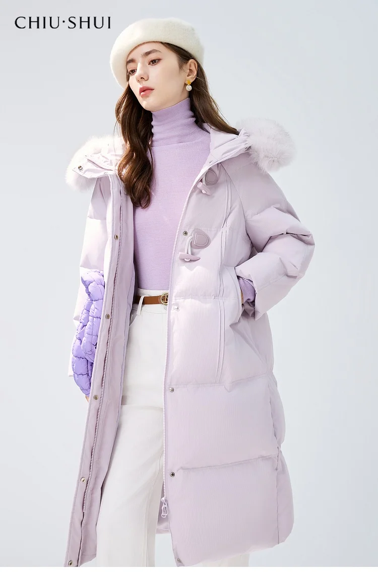 Women's Purple Mid-Length Wool Jacket New Buckle Winter Coat Hooded Collar Rabbit Snake Skin Thickened Warm Neck