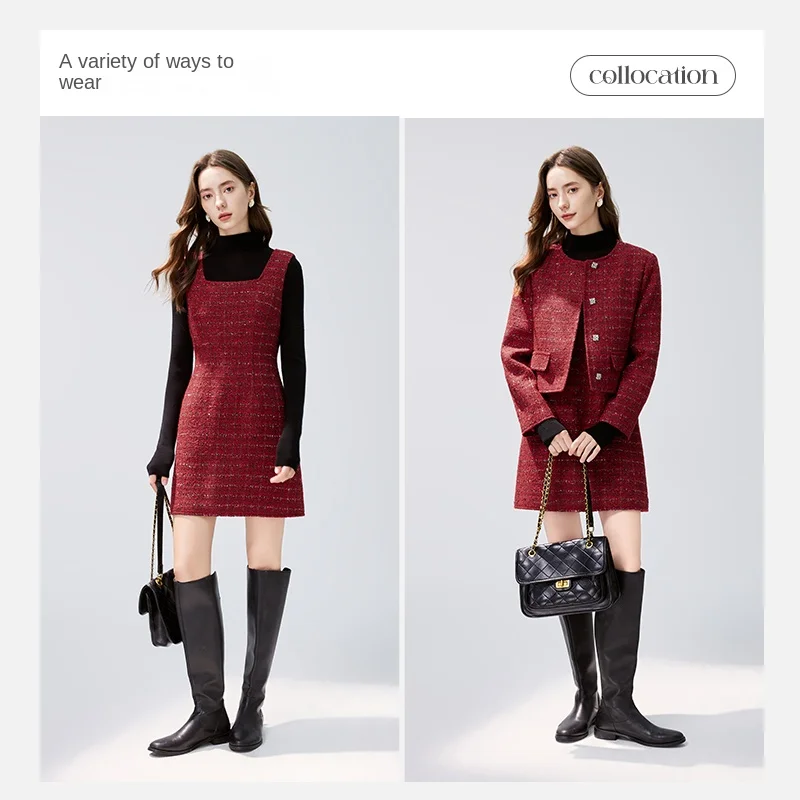 Christmas Style Women's Elegant Red Style Suit All Match Knee Square Collar Two-Piece Set Including Blazer